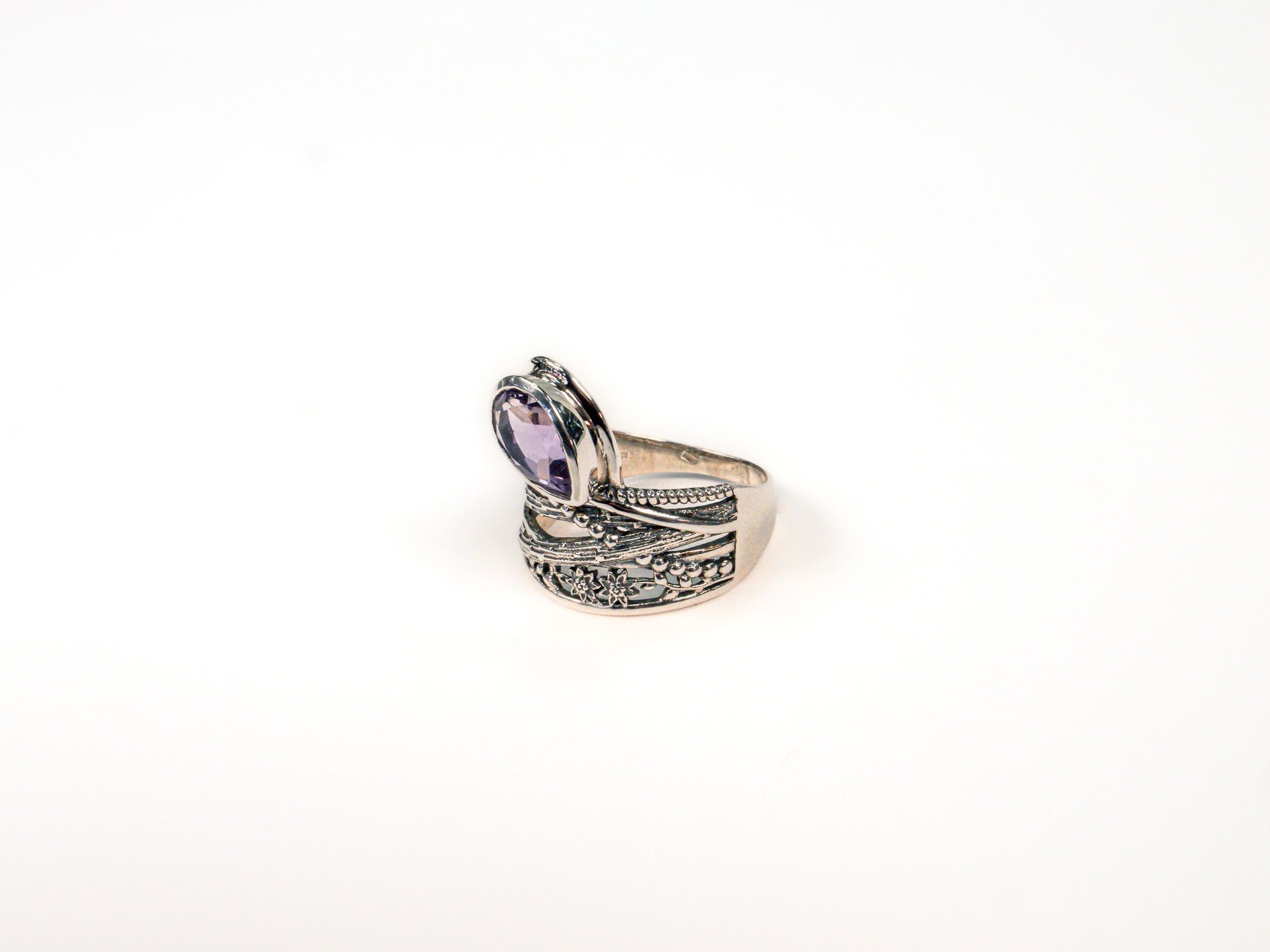 Inelul este decorat cu piatra ametist, care adauga o nota subtila de culoare si distinctie.