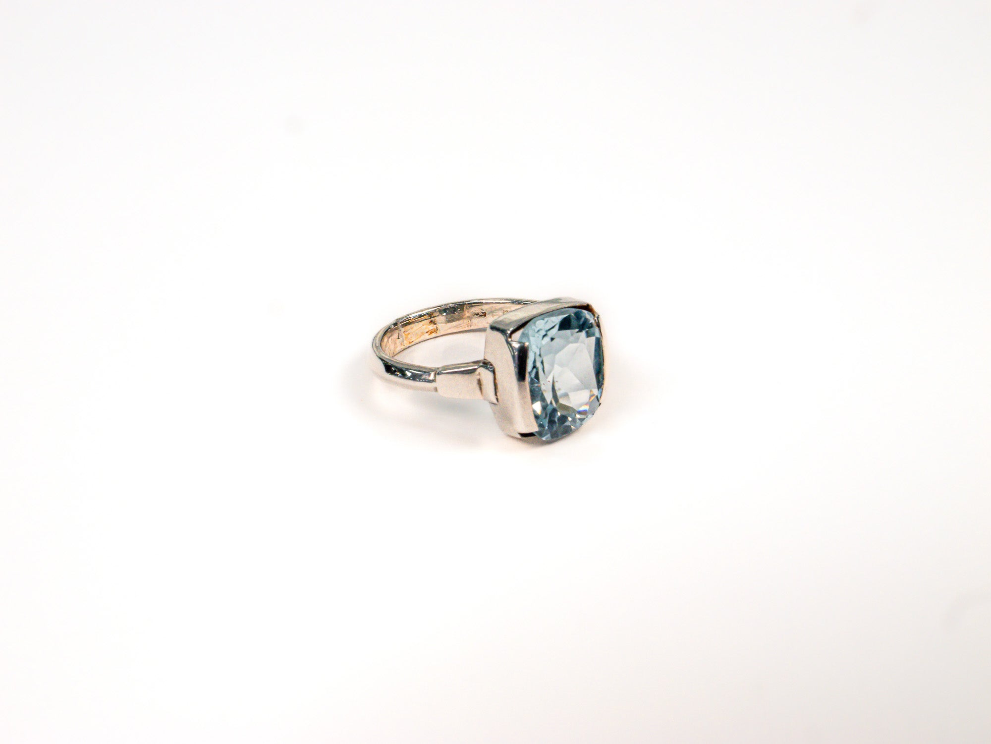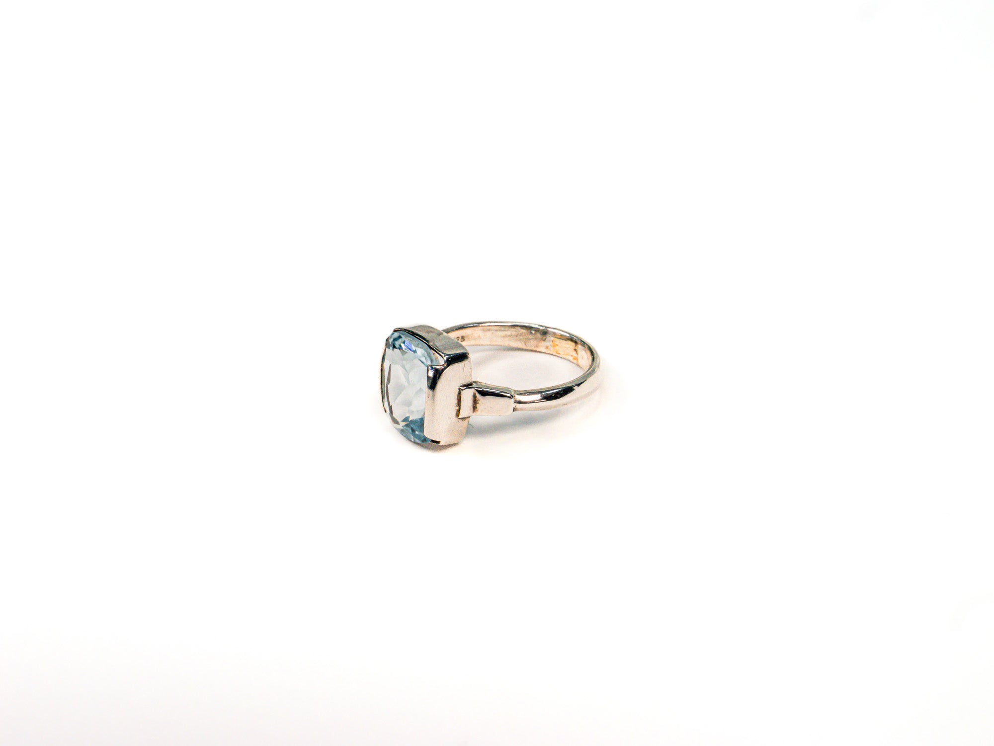 Inelul este decorat cu piatra aquamarin, care adauga o nota subtila de culoare si distinctie.