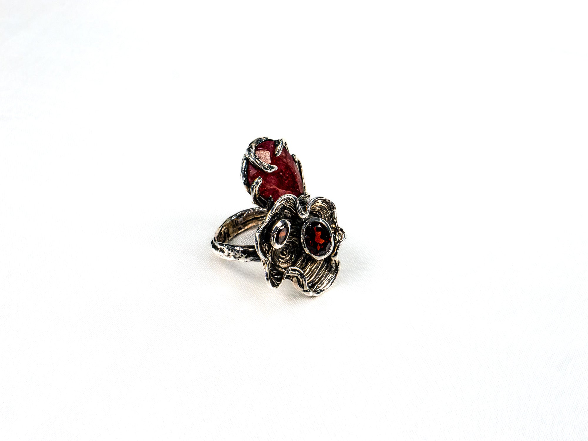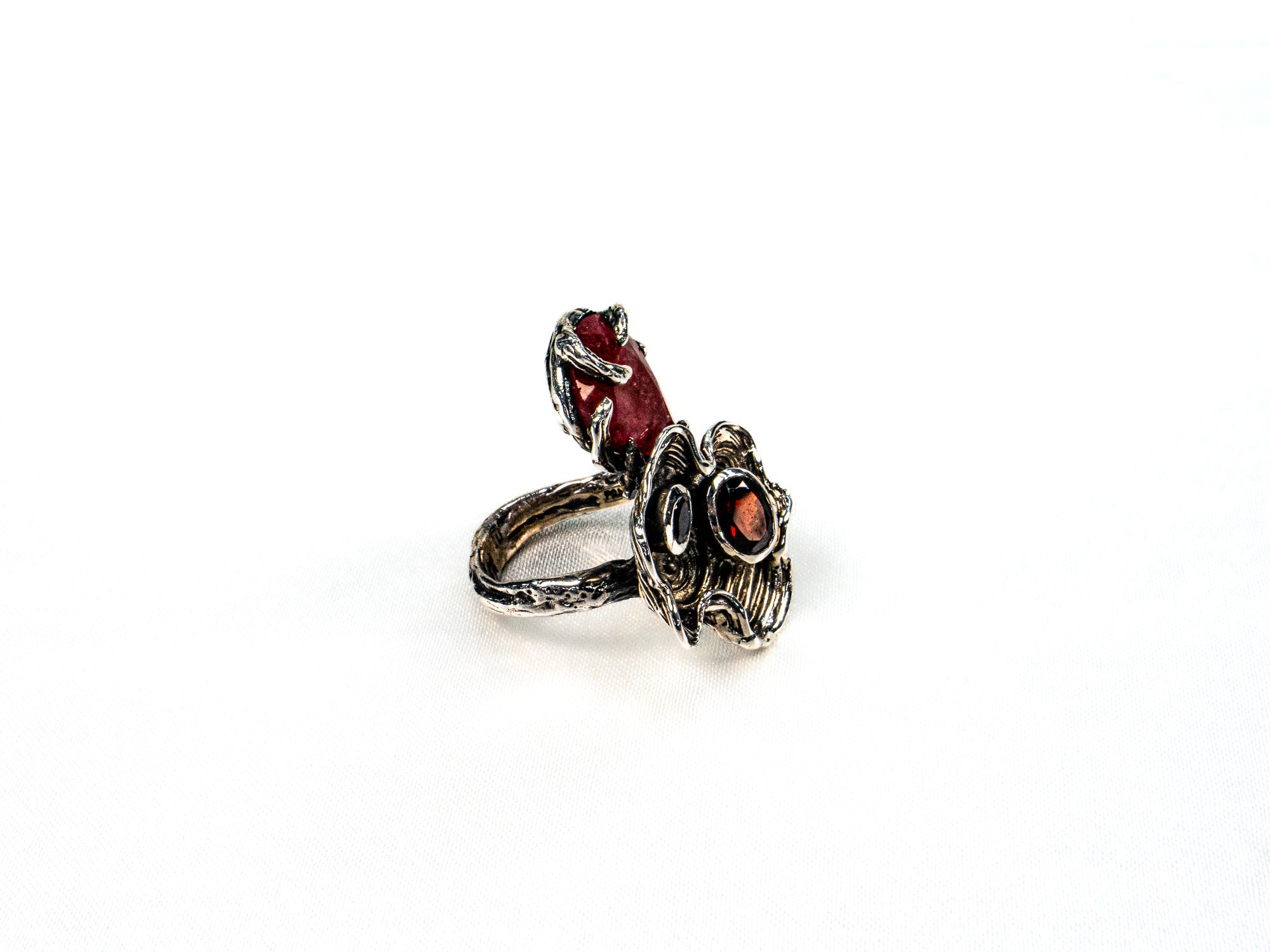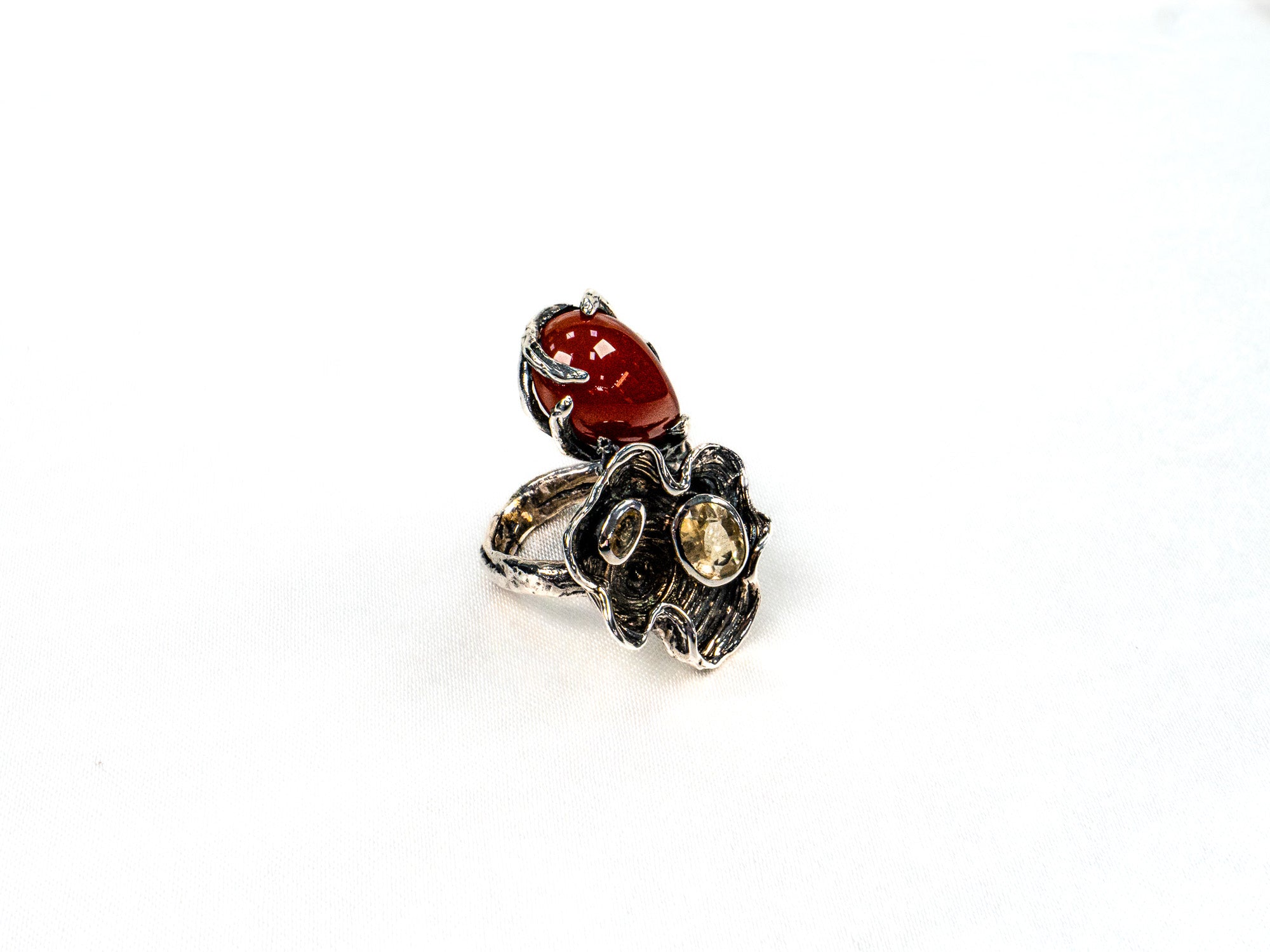 Inelul este decorat cu piatra carneol si citrin, care adauga o nota subtila de culoare si distinctie.
