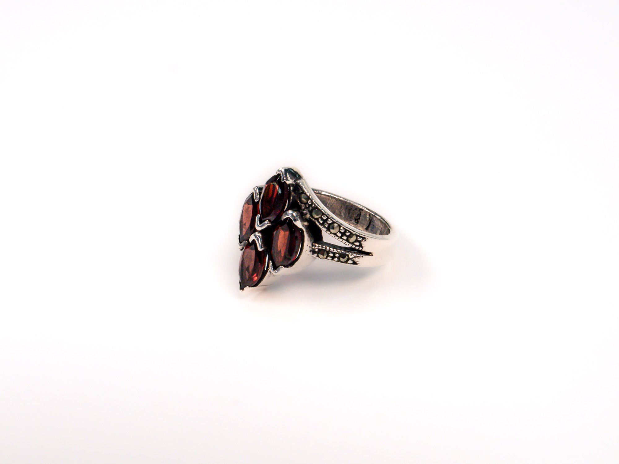 Inelul este decorat cu piatra granate, care adauga o nota subtila de culoare si distinctie.