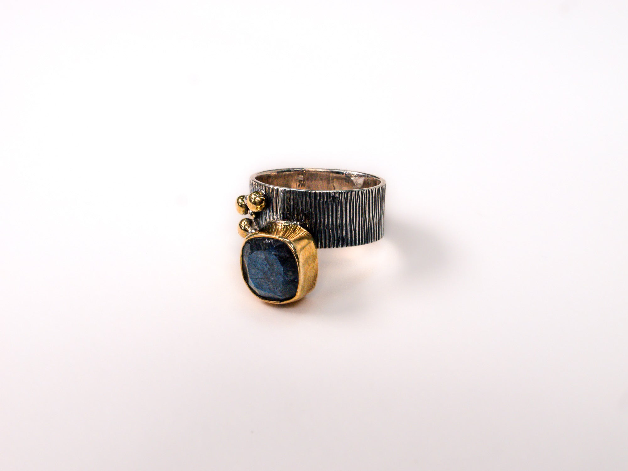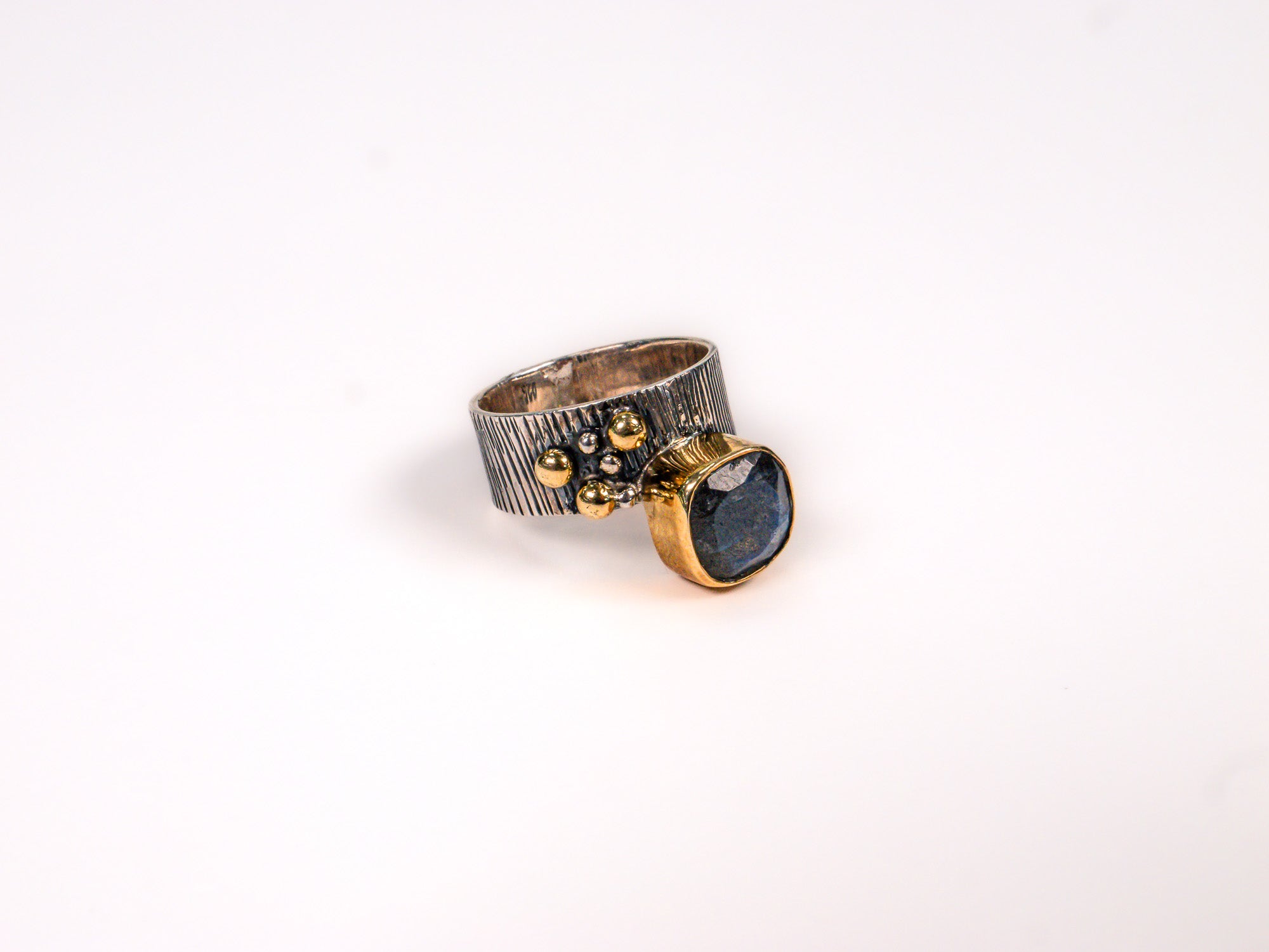 Inelul este decorat cu piatra labradorit, care adauga o nota subtila de culoare si distinctie.