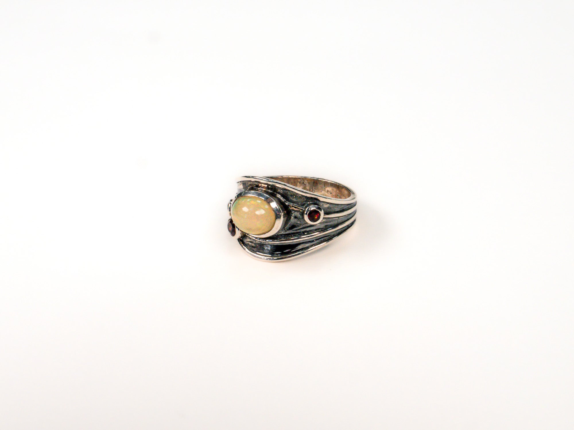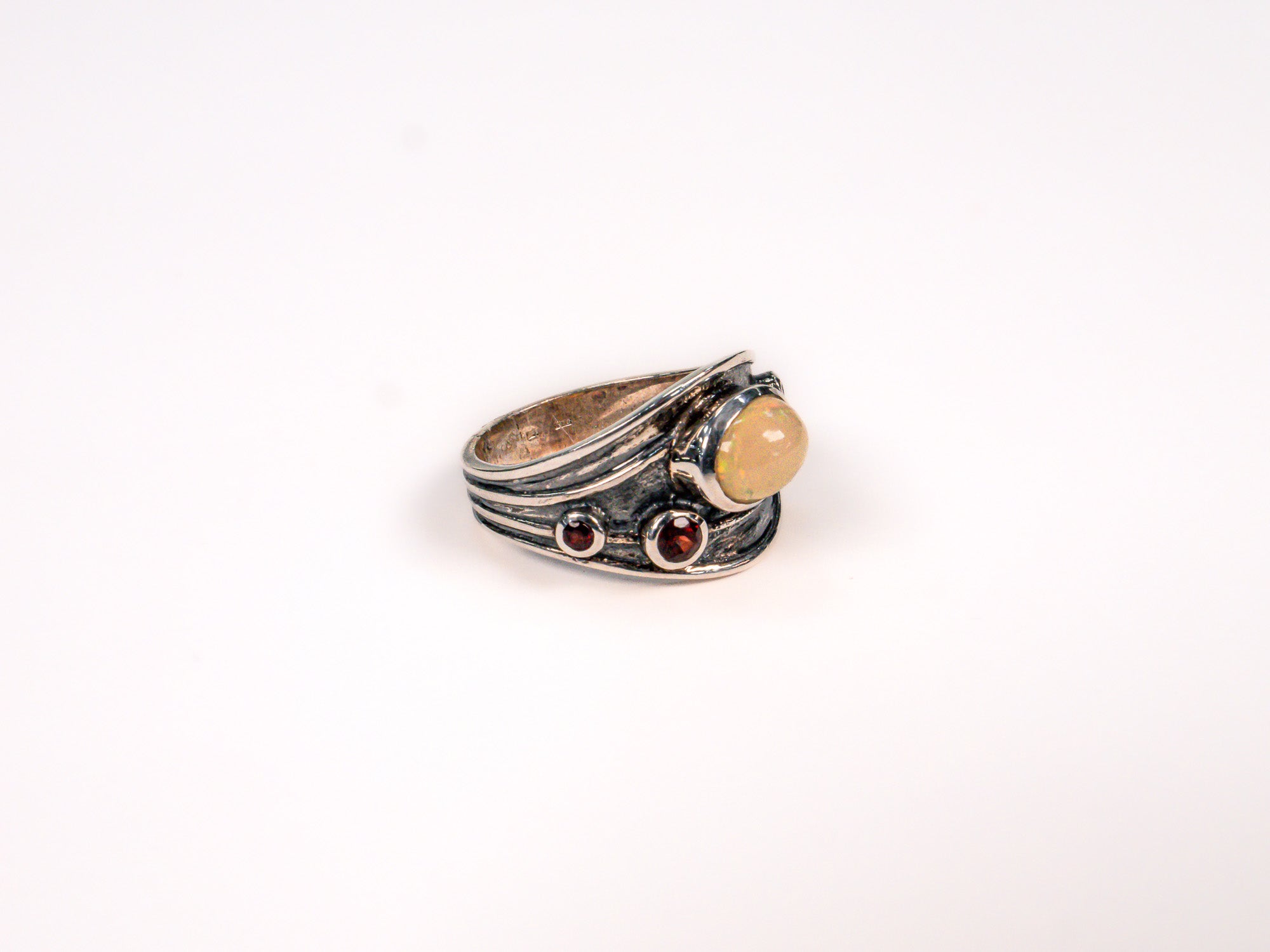 Inelul este decorat cu piatra opal, care adauga o nota subtila de culoare si distinctie.
