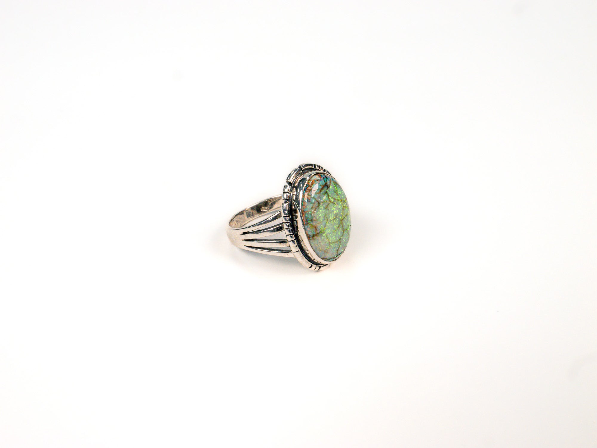 Inelul este decorat cu piatra opal, care adauga o nota subtila de culoare si distinctie.