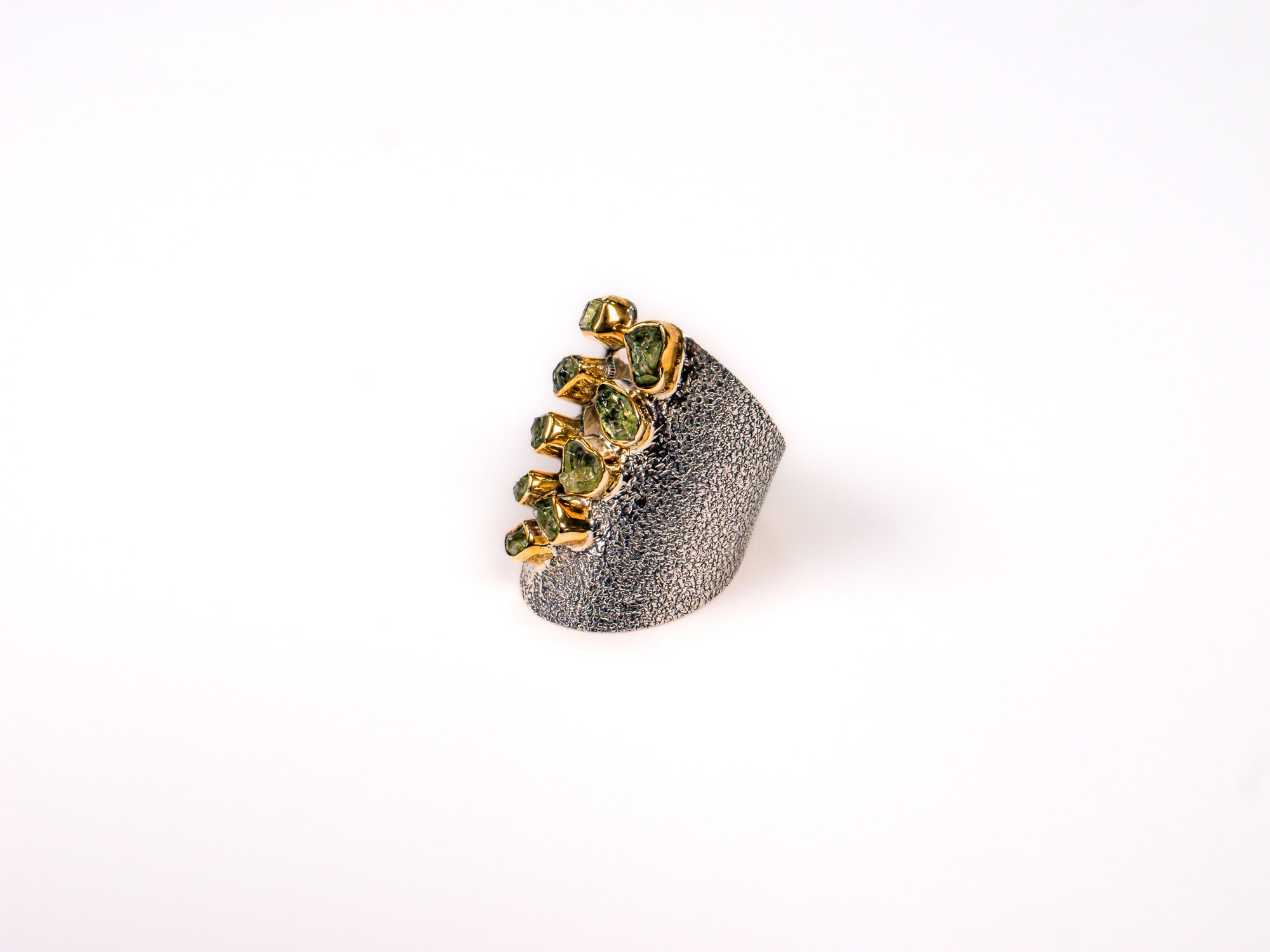Inelul este decorat cu piatra peridot, care adauga o nota subtila de culoare si distinctie.