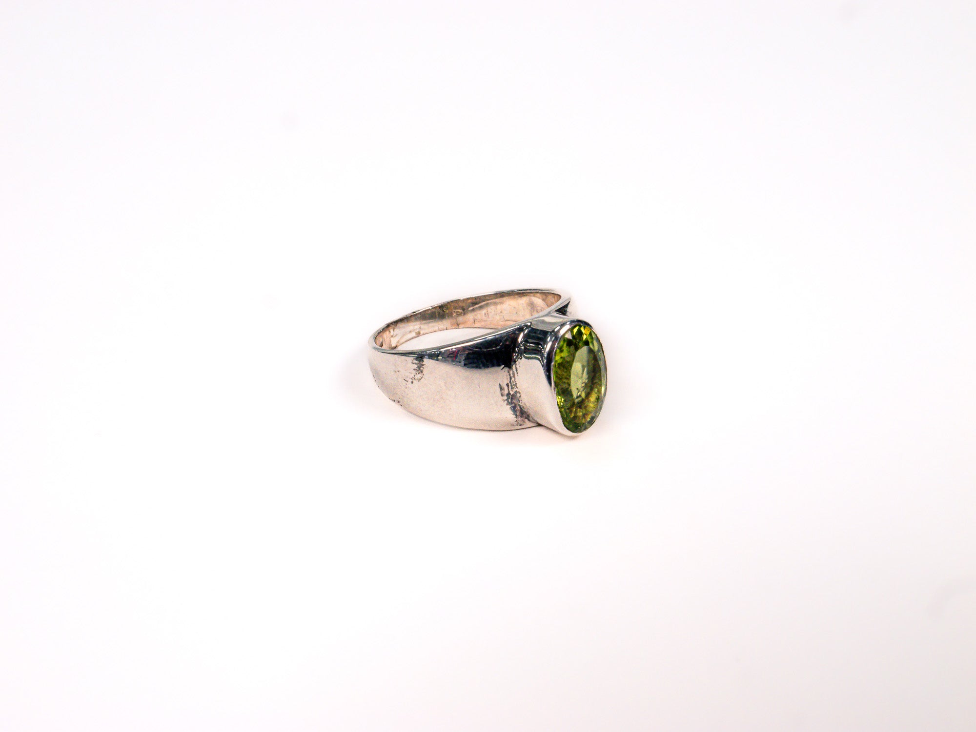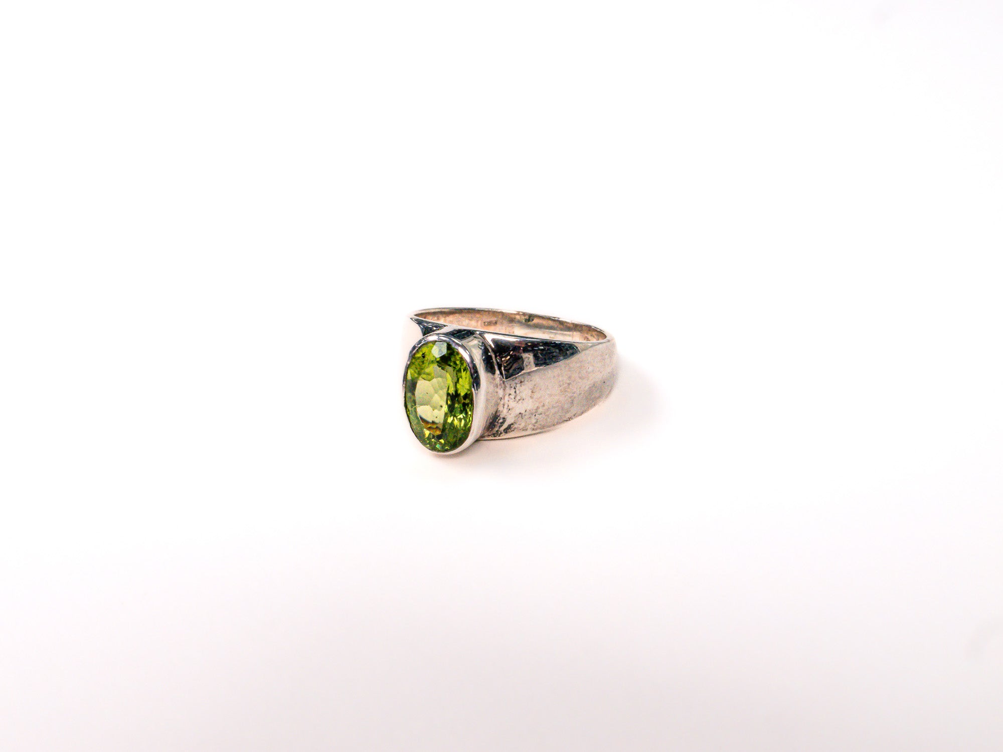Inelul este decorat cu piatra peridot, care adauga o nota subtila de culoare si distinctie.