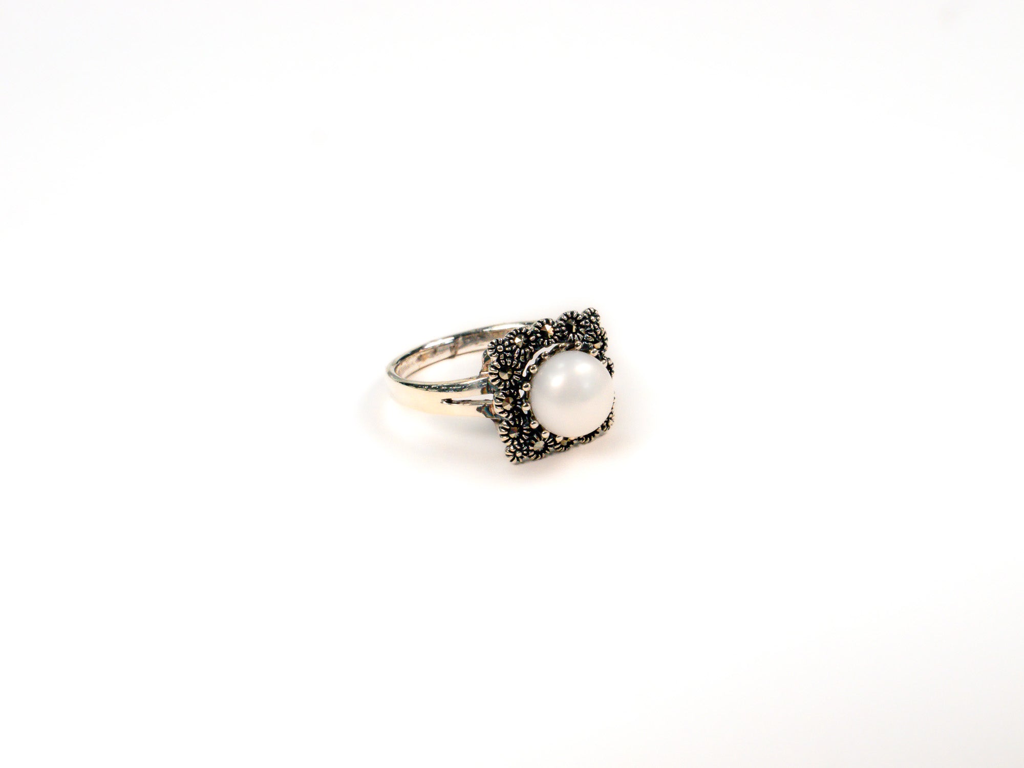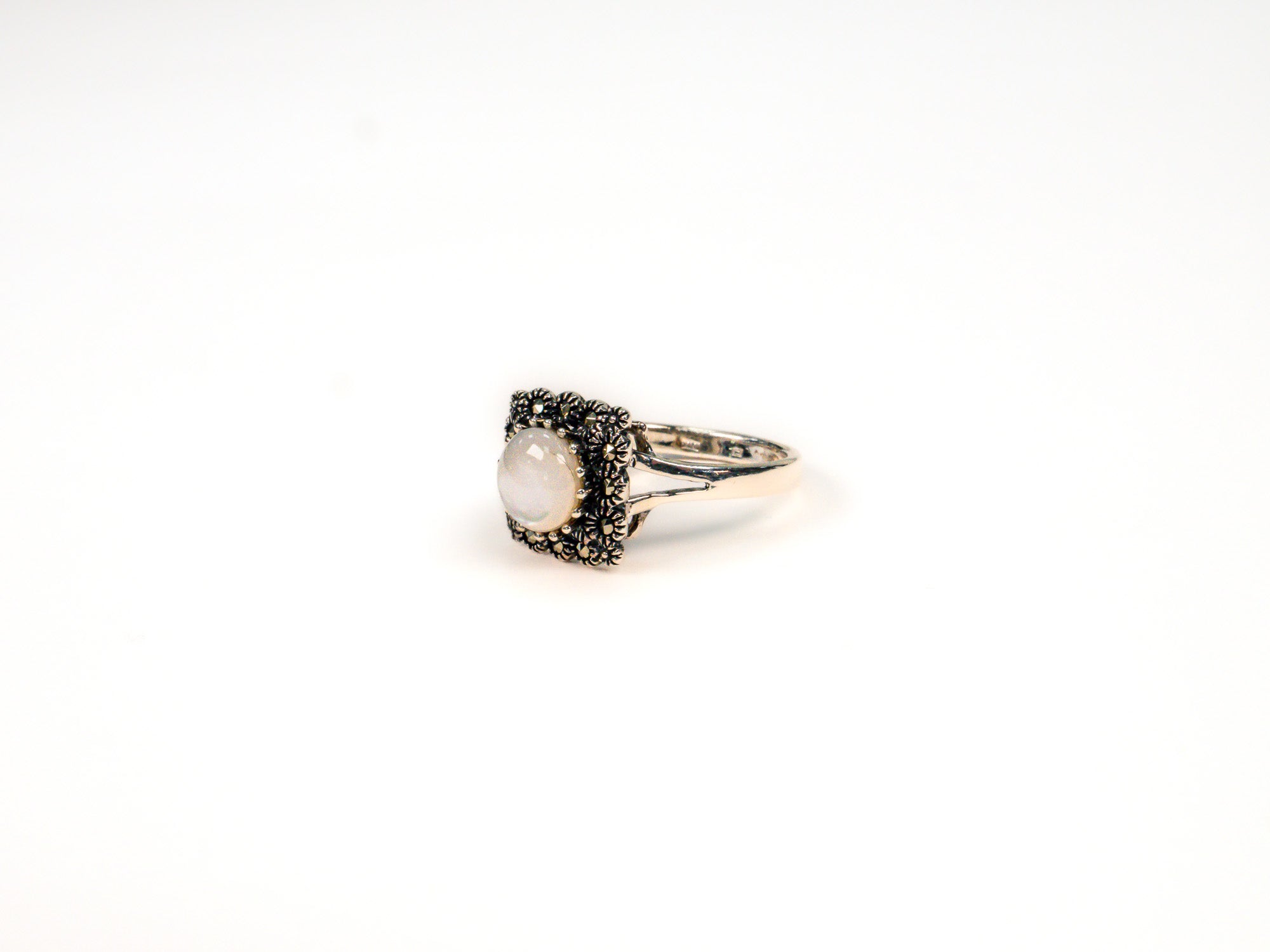 Inelul este decorat cu piatra sidef alb, care adauga o nota subtila de culoare si distinctie.