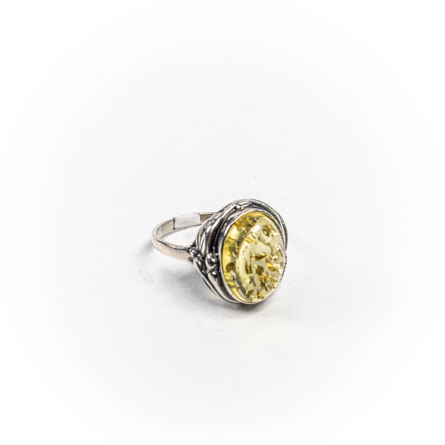 Inelul este decorat cu piatra chihlimbar, care adauga o nota subtila de culoare si distinctie.