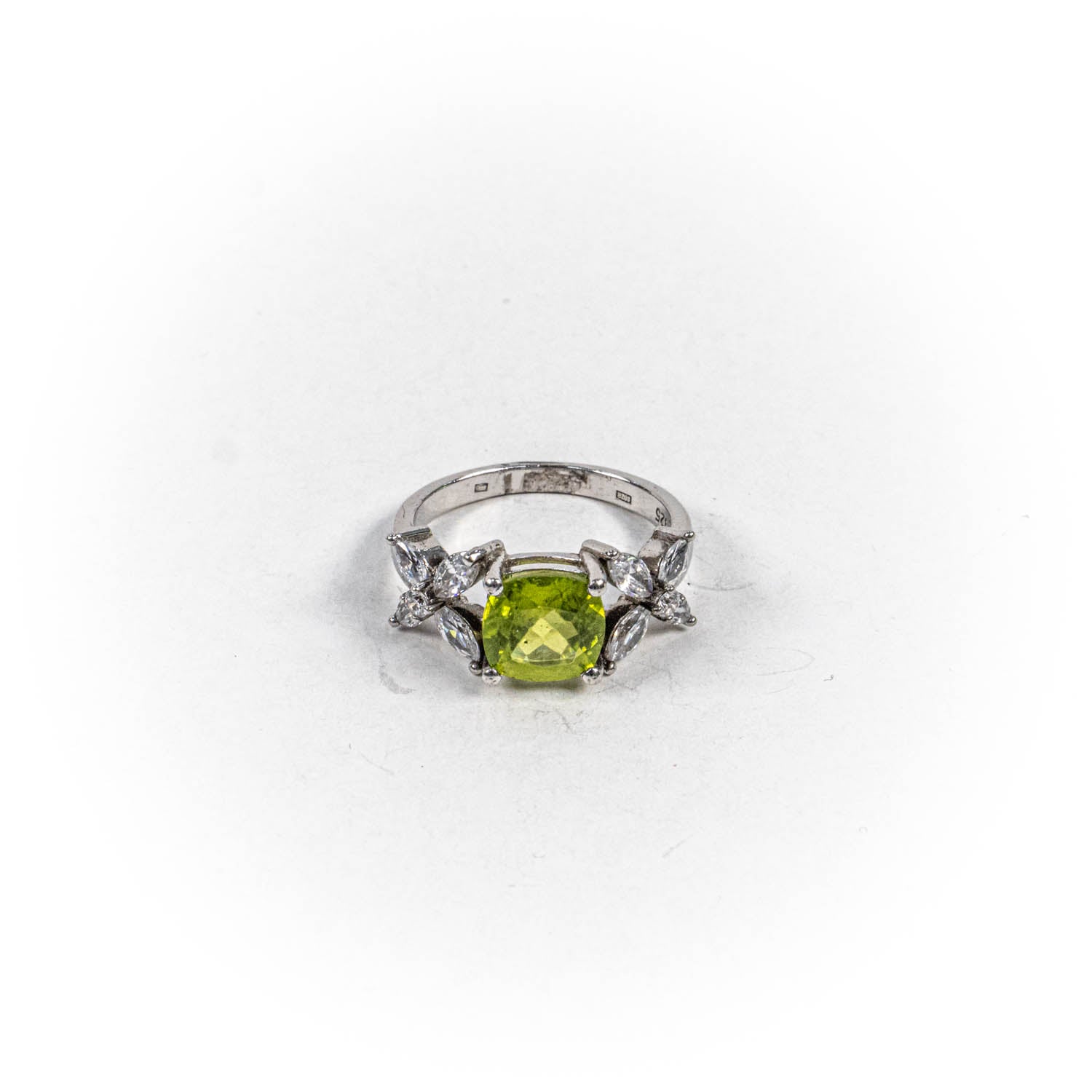 Inelul este decorat cu piatra peridot, care adauga o nota subtila de culoare si distinctie.