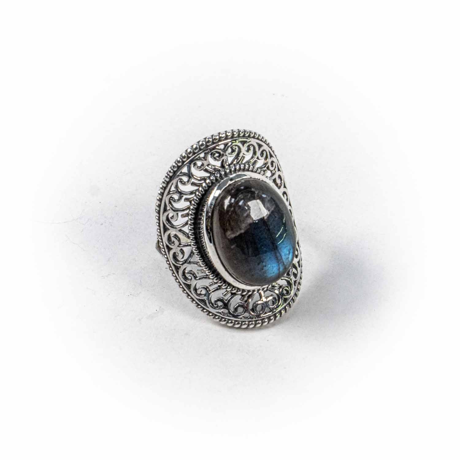 Inelul este decorat cu piatra labradorit, care adauga o nota subtila de culoare si distinctie.