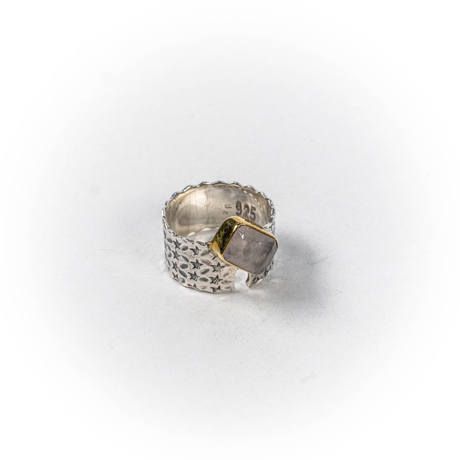Inelul este decorat cu piatra cuart roz, care adauga o nota subtila de culoare si distinctie.