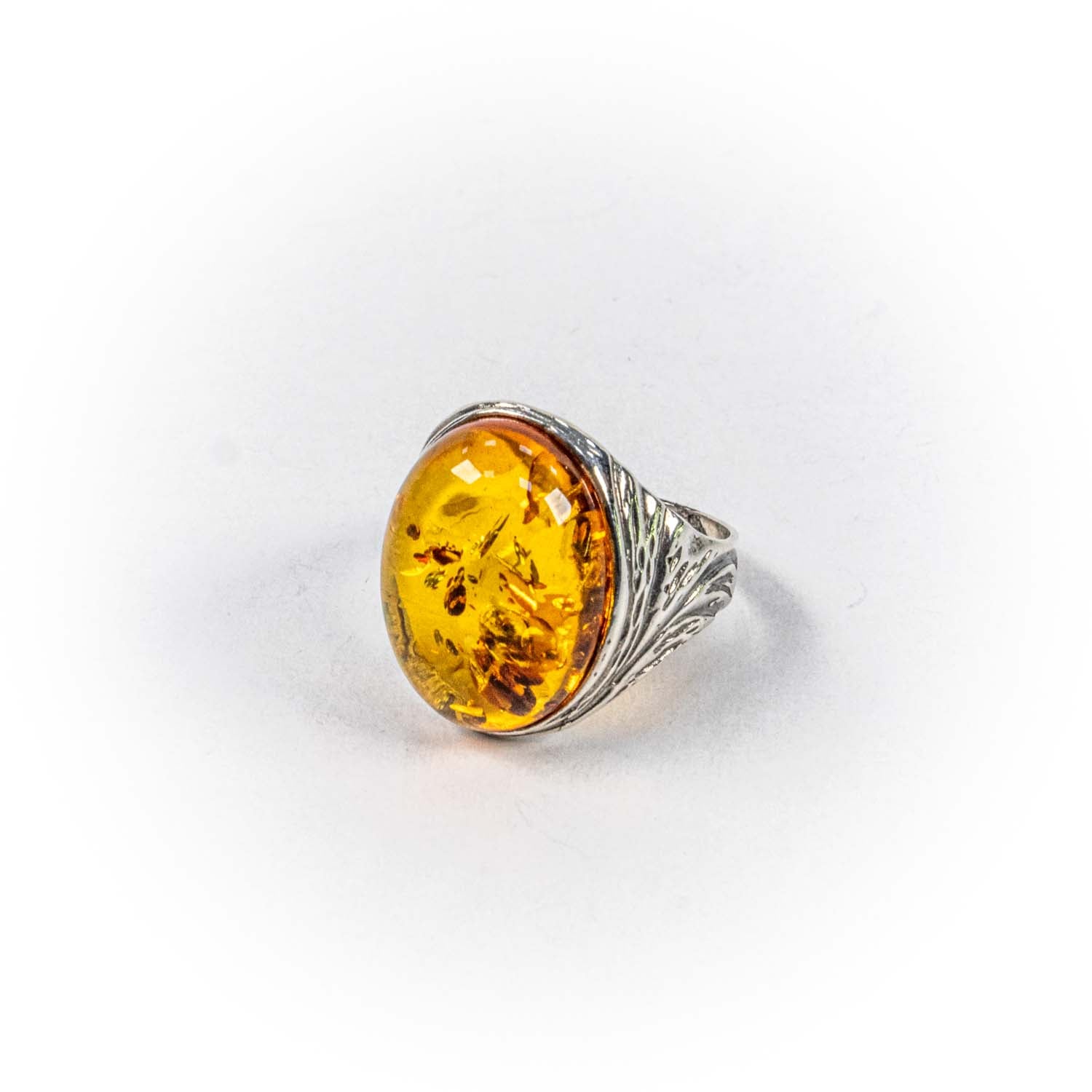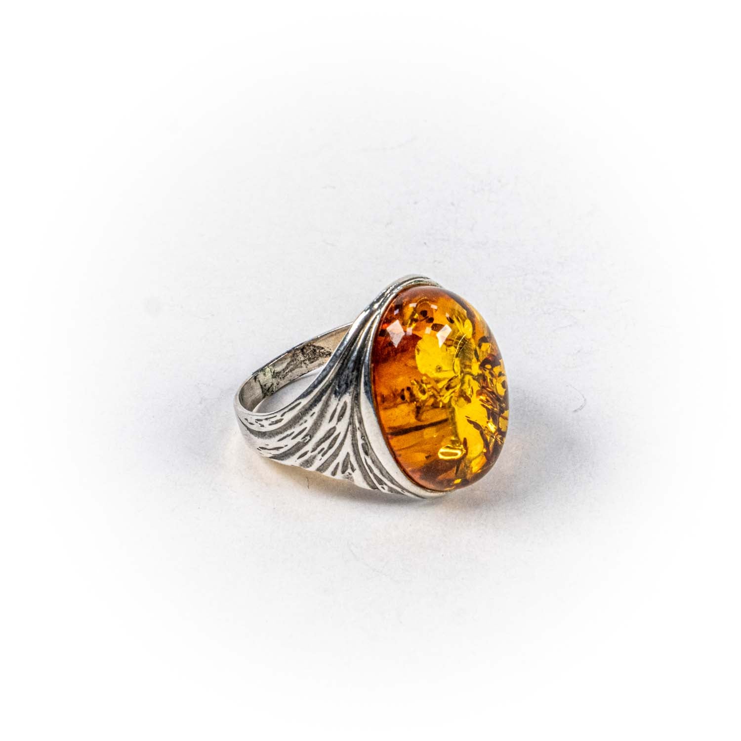 Inelul este decorat cu piatra chihlimbar, care adauga o nota subtila de culoare si distinctie.