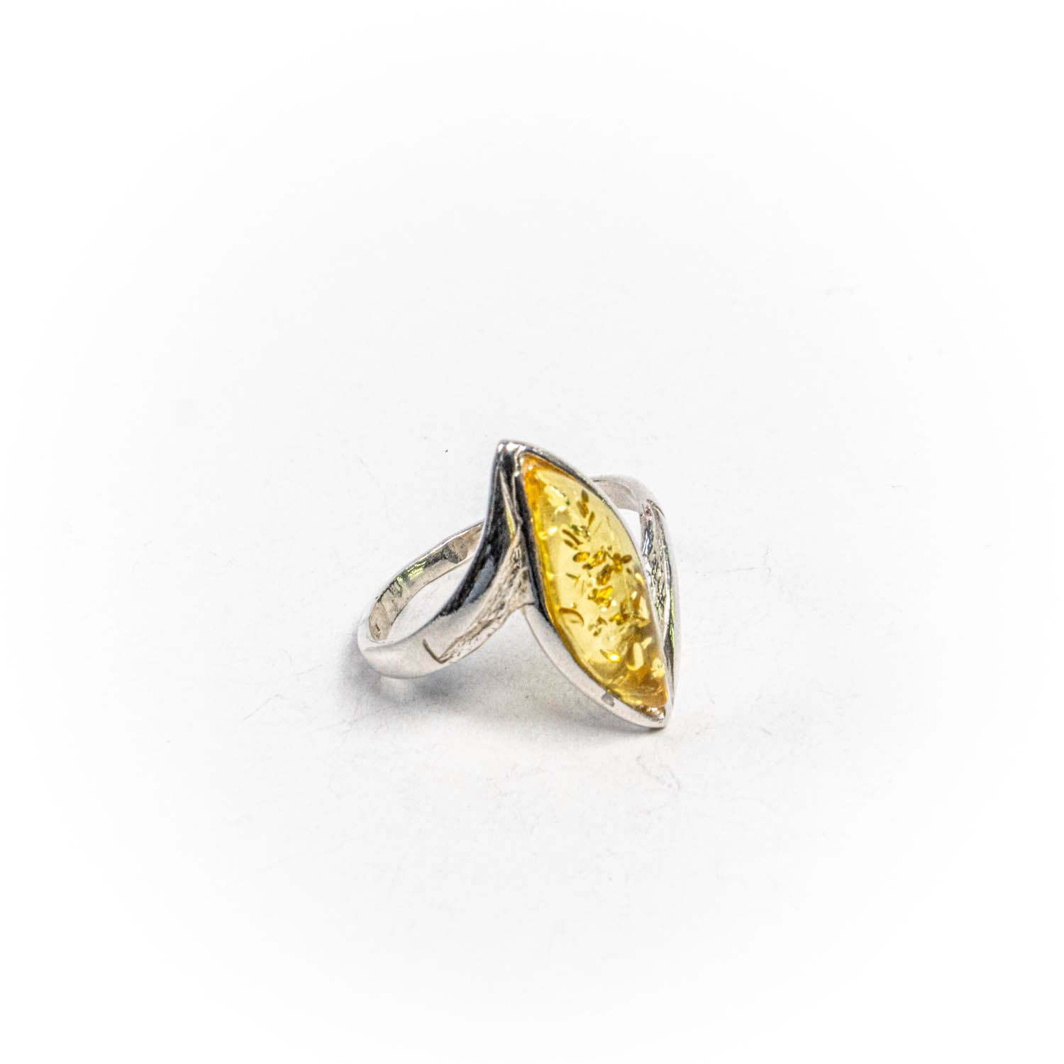Inelul este decorat cu piatra chihlimbar, care adauga o nota subtila de culoare si distinctie.