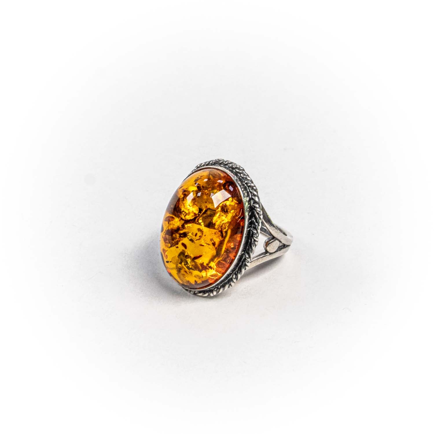 Inelul este decorat cu piatra chihlimbar, care adauga o nota subtila de culoare si distinctie.