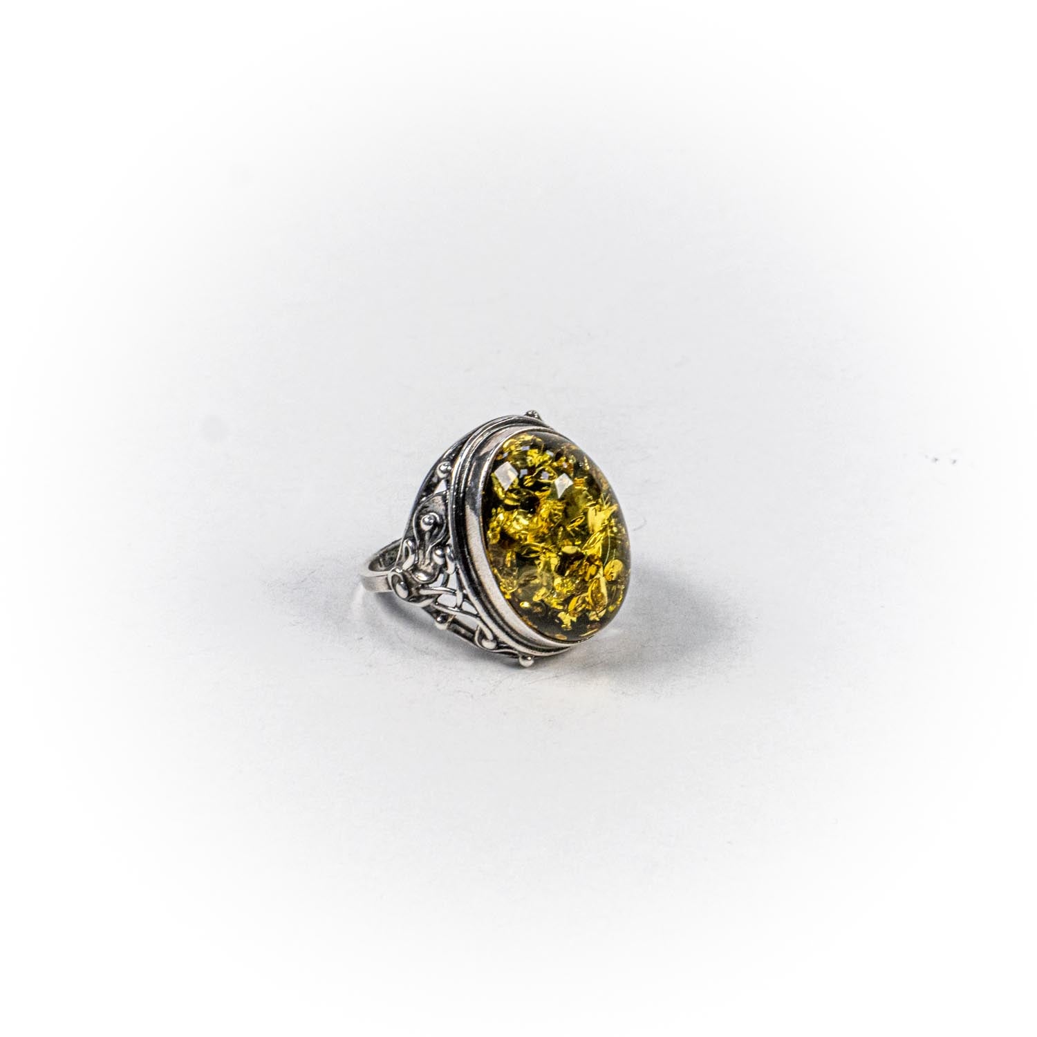 Inelul este decorat cu piatra chihlimbar, care adauga o nota subtila de culoare si distinctie.