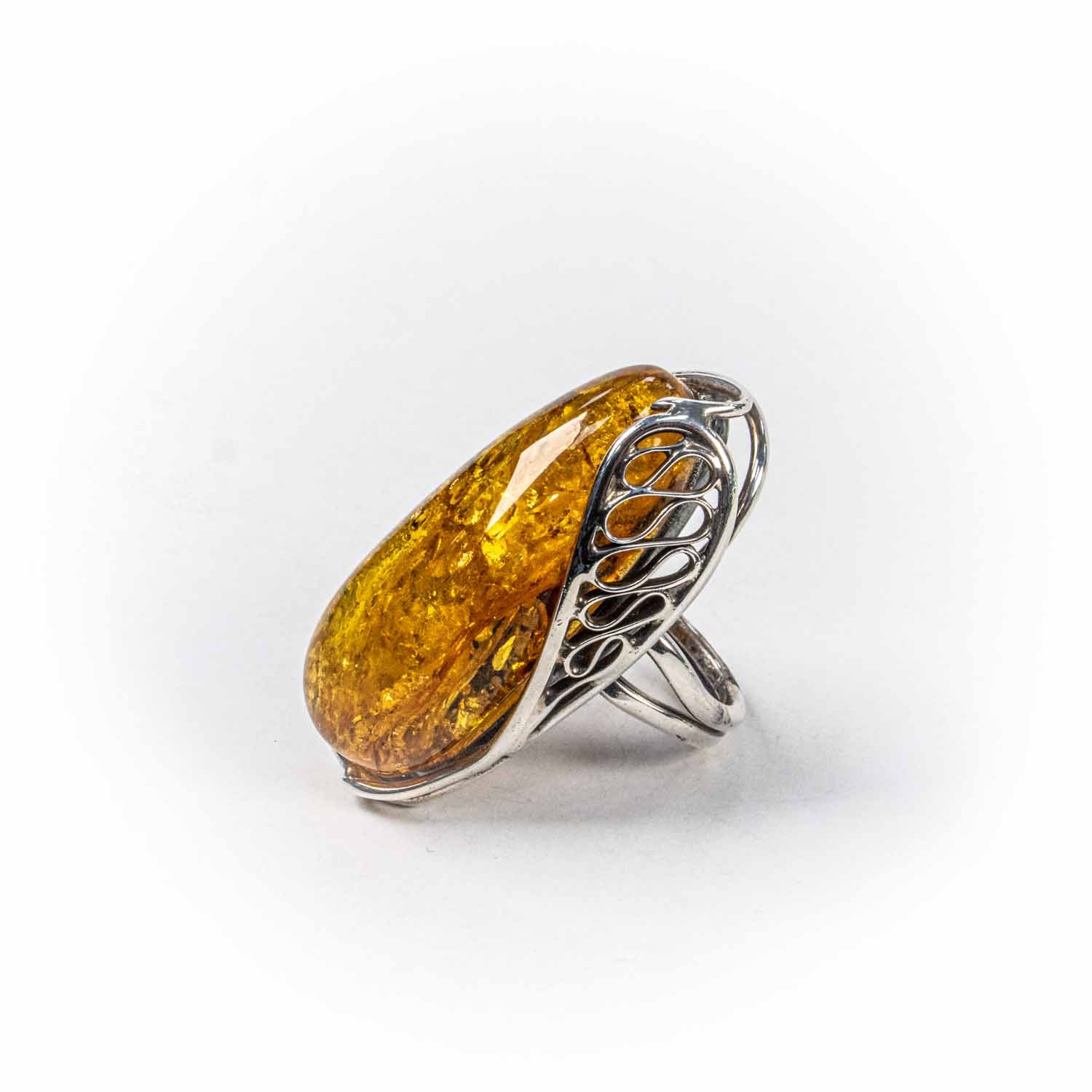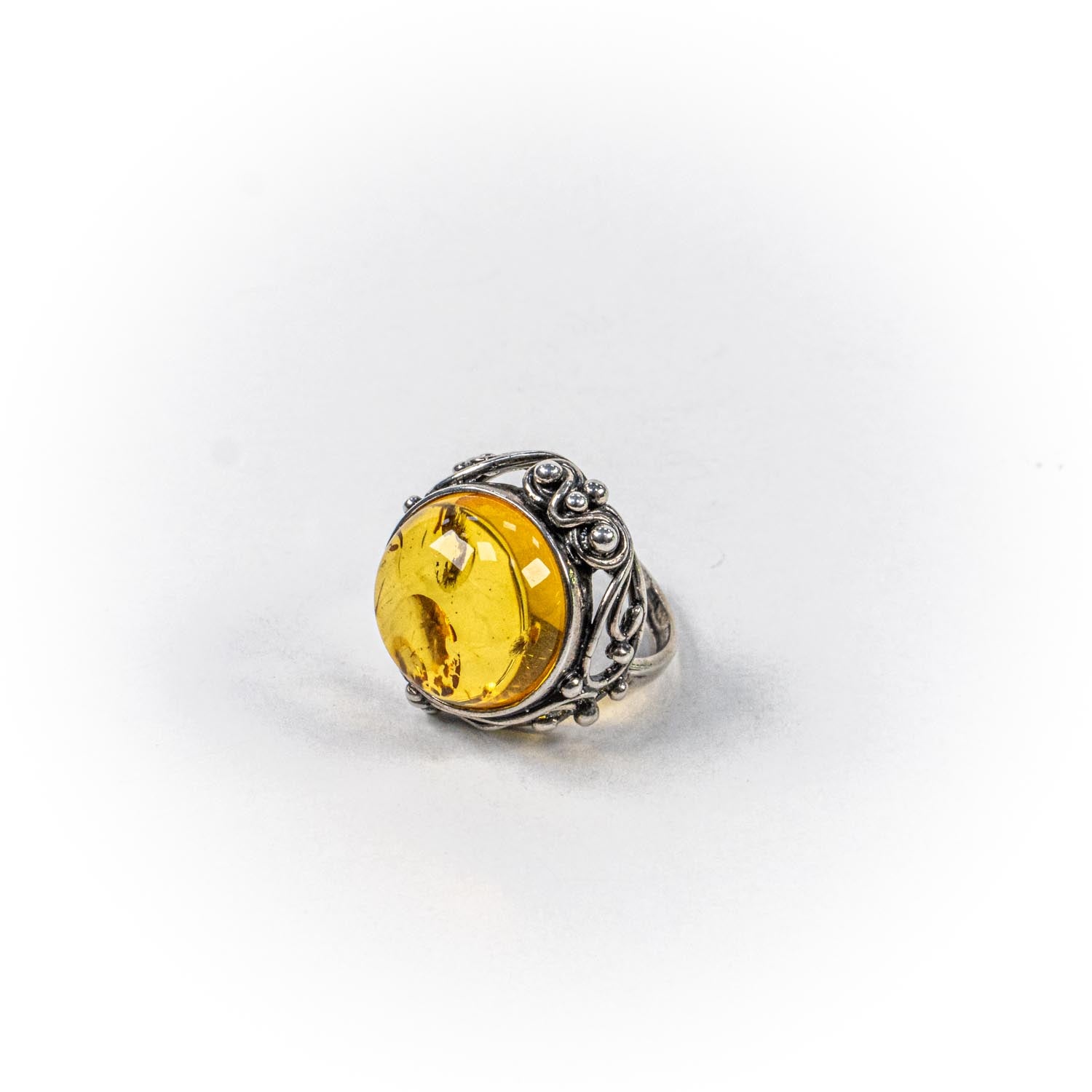 Inelul este decorat cu piatra chihlimbar, care adauga o nota subtila de culoare si distinctie.