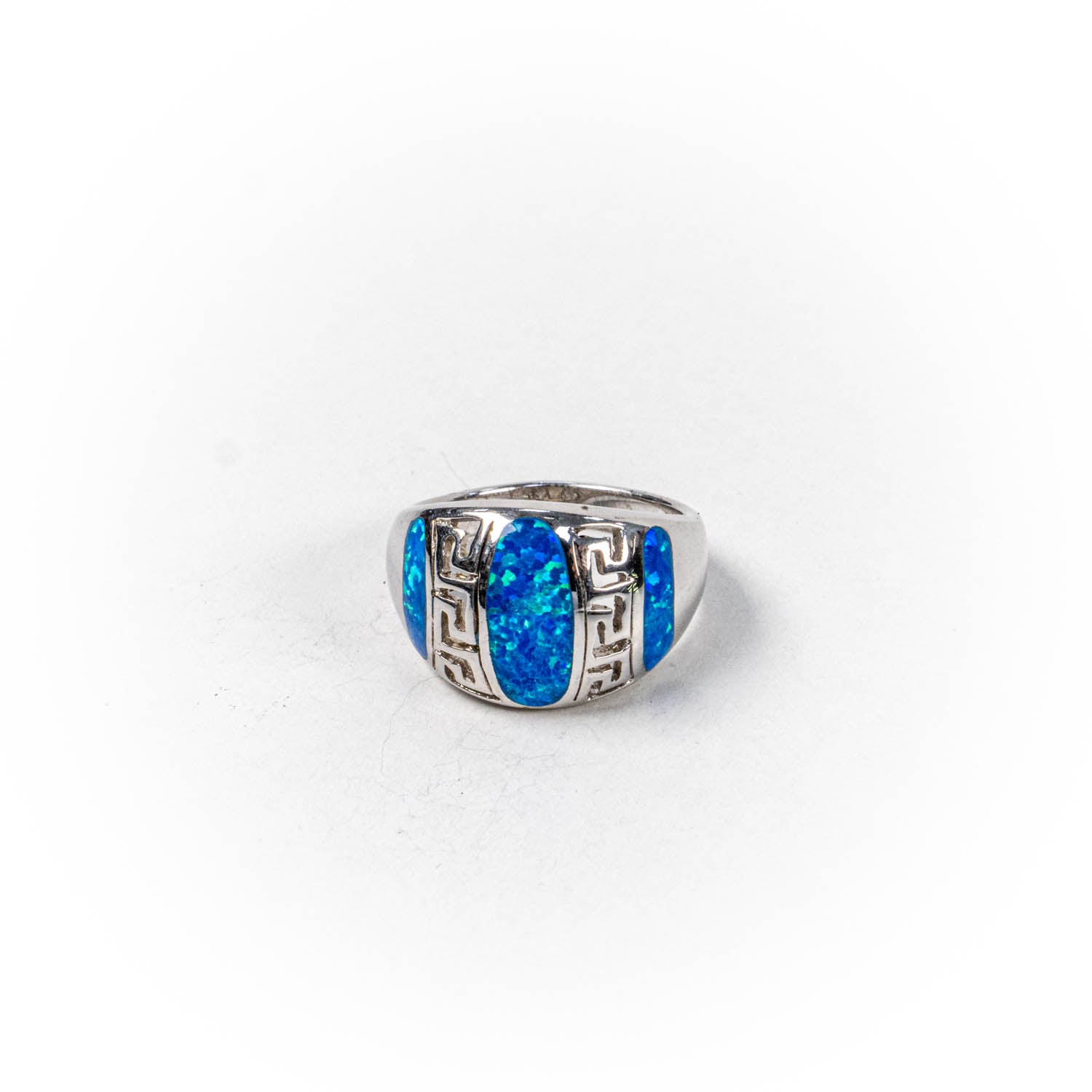 Inelul este decorat cu piatra opal albastru, care adauga o nota subtila de culoare si distinctie.