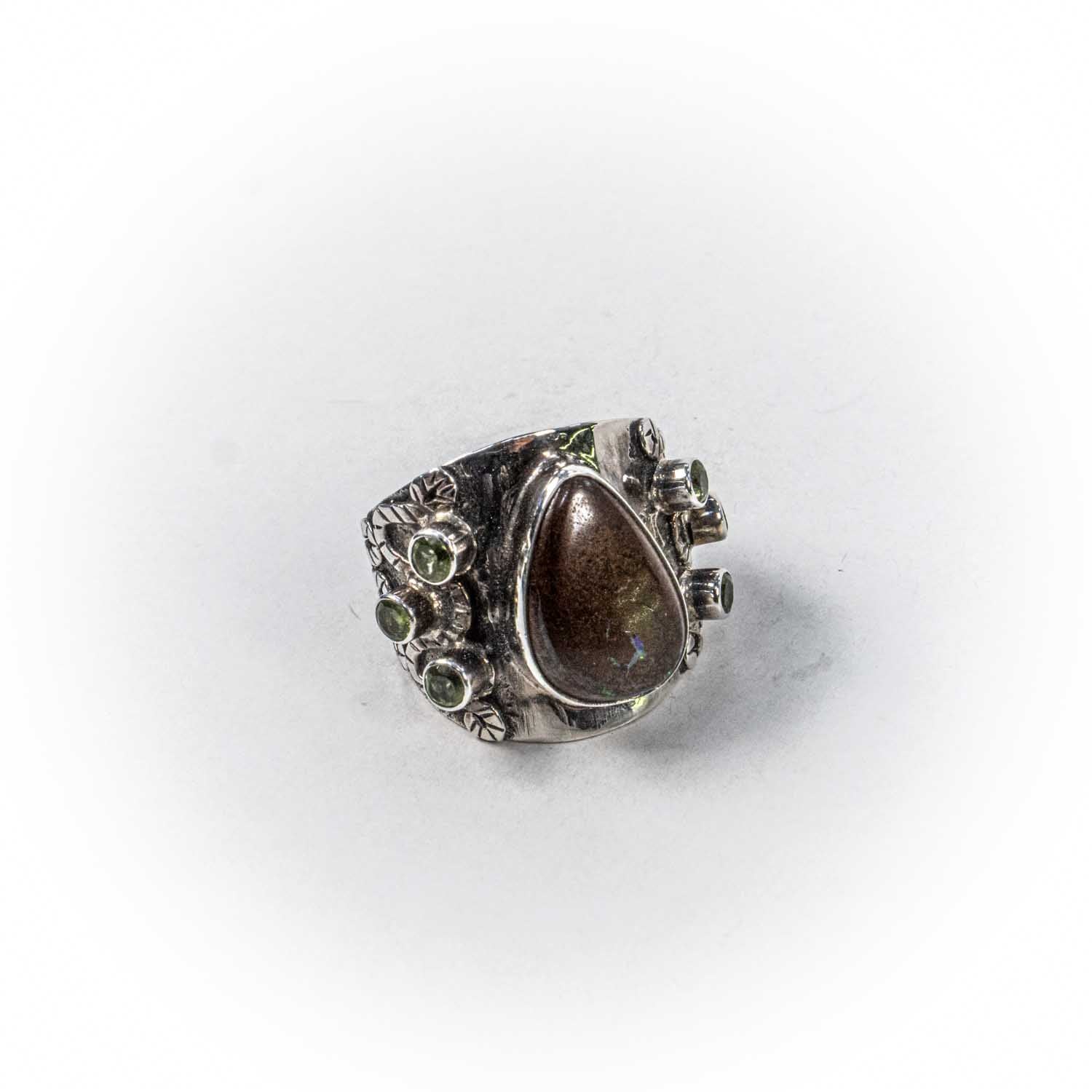 Inelul este decorat cu piatra jasp si peridotmaro, care adauga o nota subtila de culoare si distinctie.