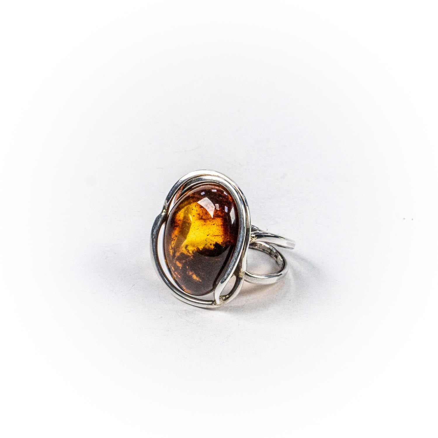 Inelul este decorat cu piatra chihlimbar, care adauga o nota subtila de culoare si distinctie.
