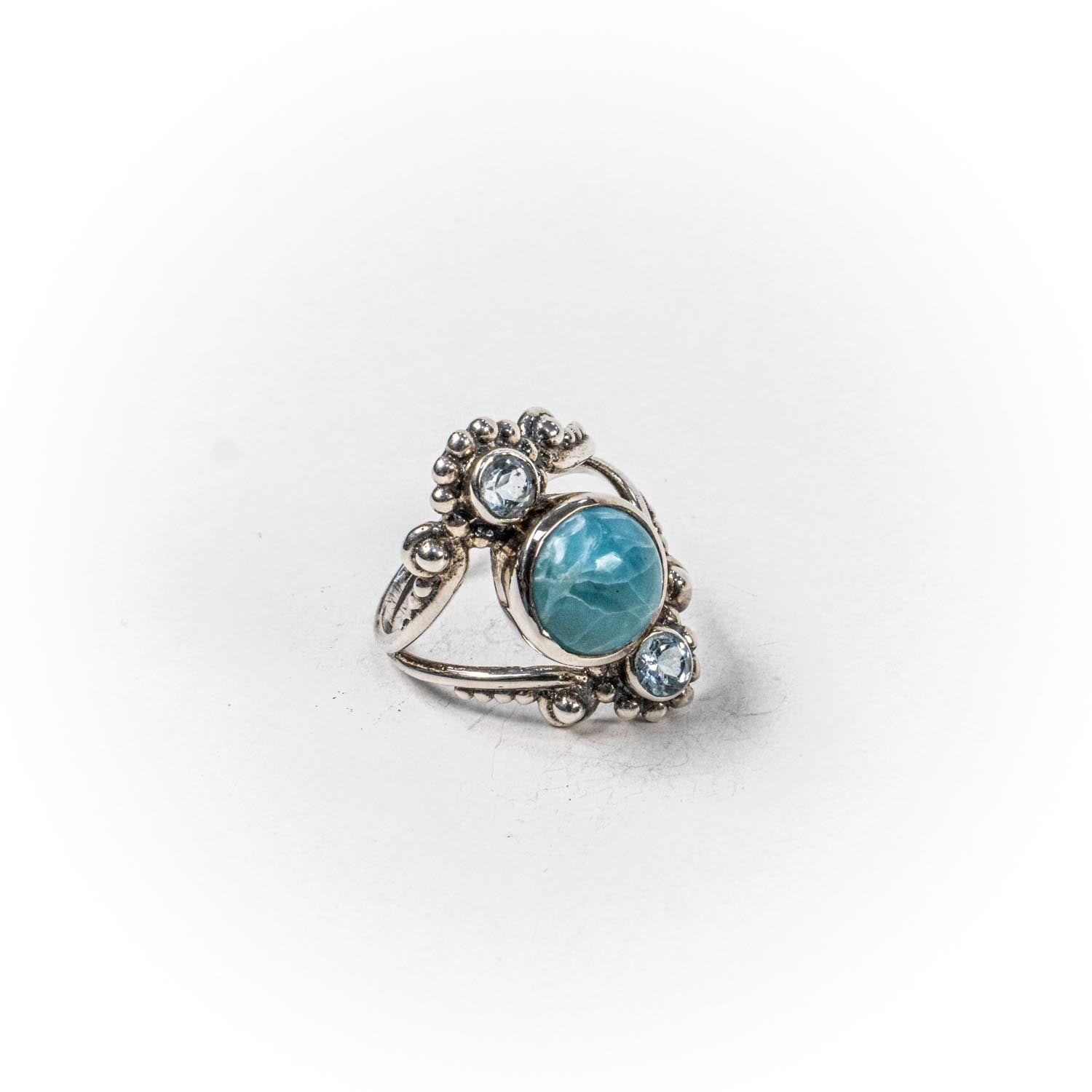 Inelul este decorat cu piatra larimar si aquamarin, care adauga o nota subtila de culoare si distinctie.