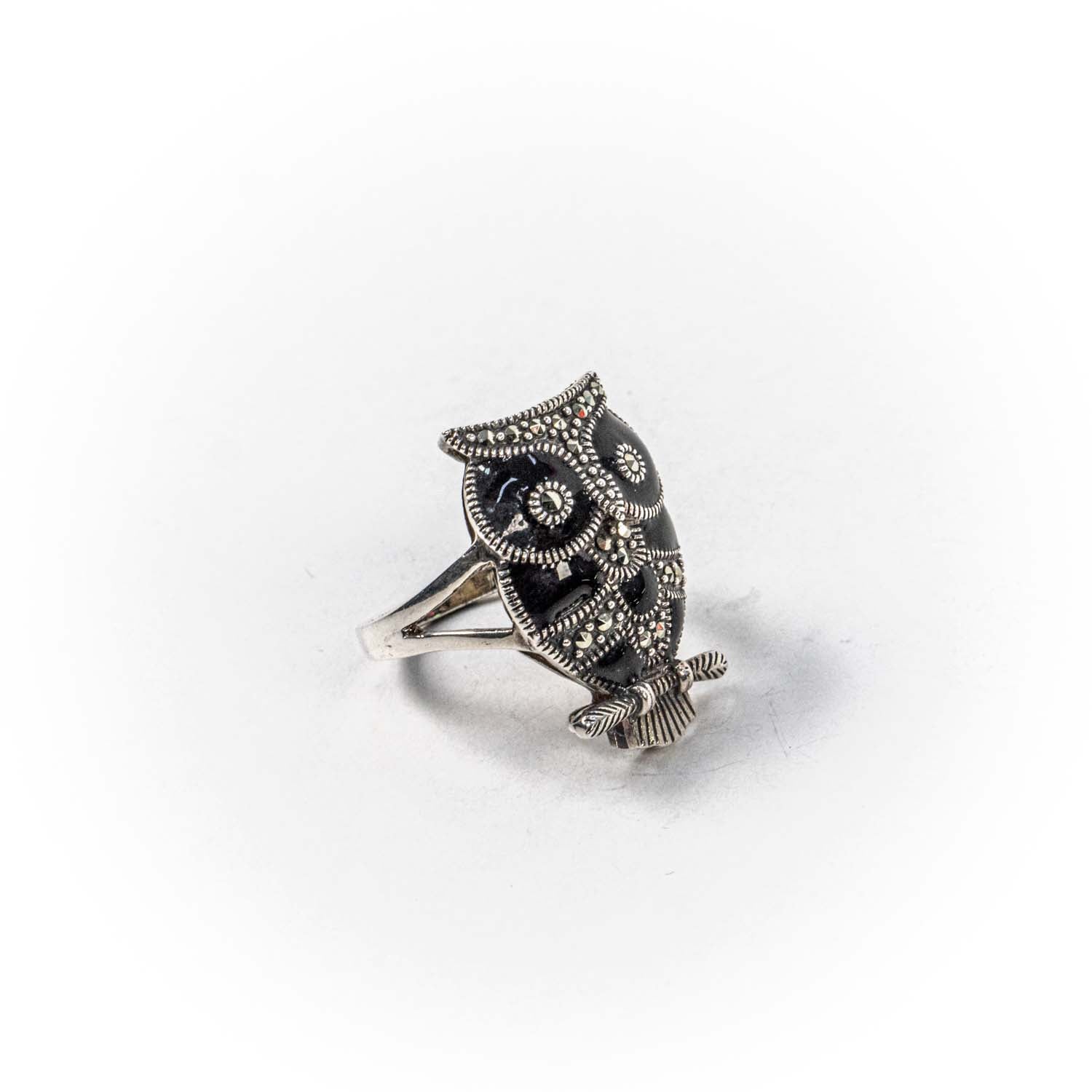 Inelul este decorat cu piatra onix si marcasite, care adauga o nota subtila de culoare si distinctie.