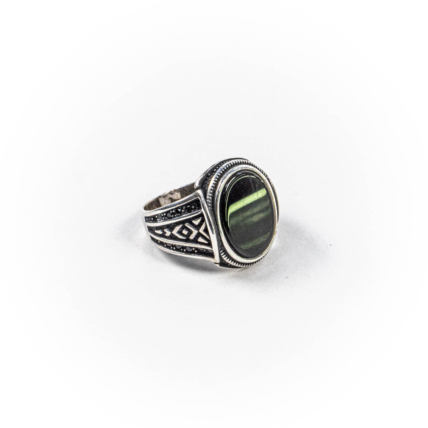 Inelul este decorat cu piatra onix, care adauga o nota subtila de culoare si distinctie.