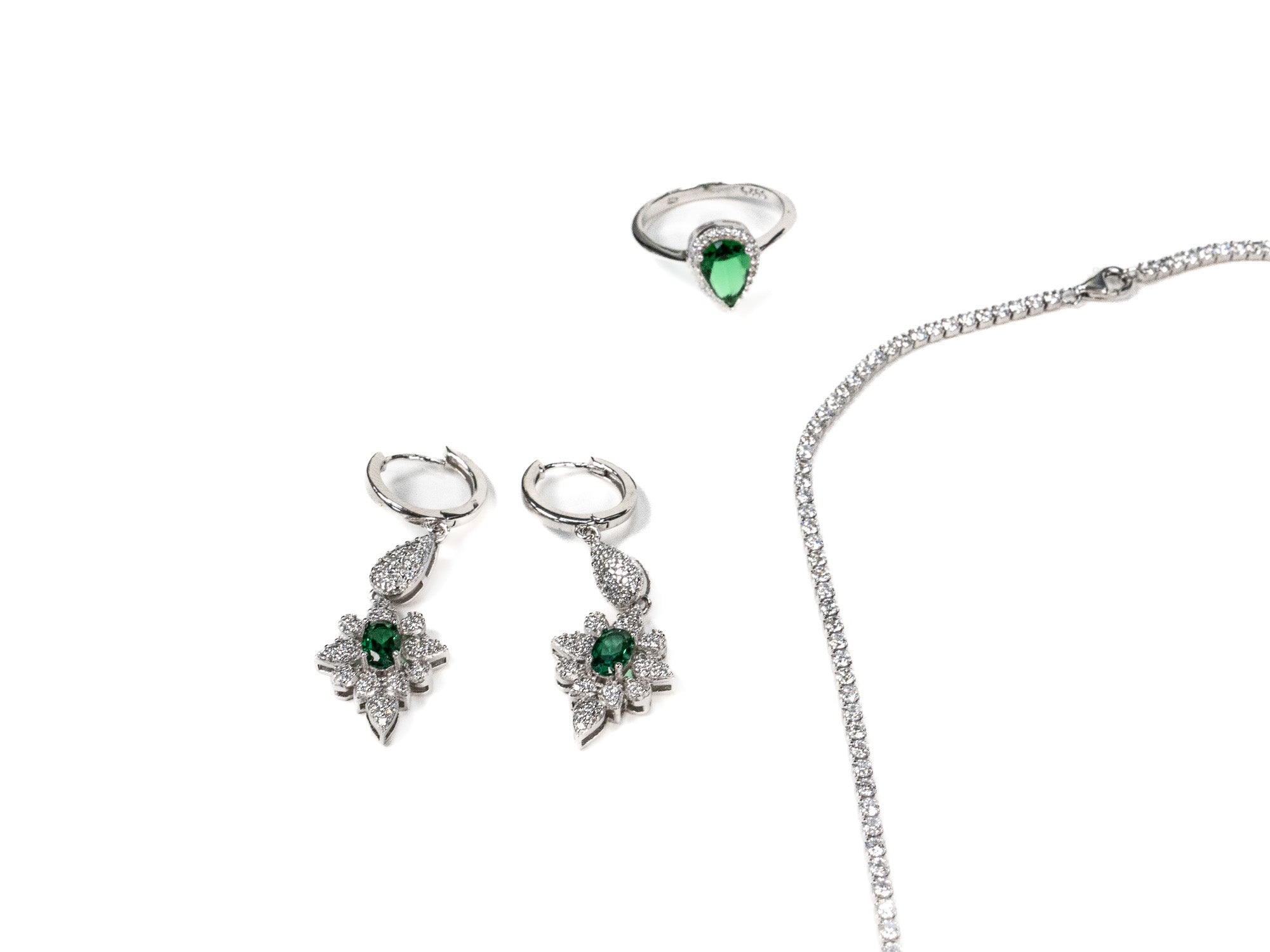 Descopera Set Bijuterii din Argint 925 - Cercei, Inel, Lant, Bratara, un set de bijuterii din Argint 925 compus din cercei, inel, lant, bratara, decorat cu Zirconia, in nuante Verde, perfect pentru a adauga eleganta oricarei tinute.