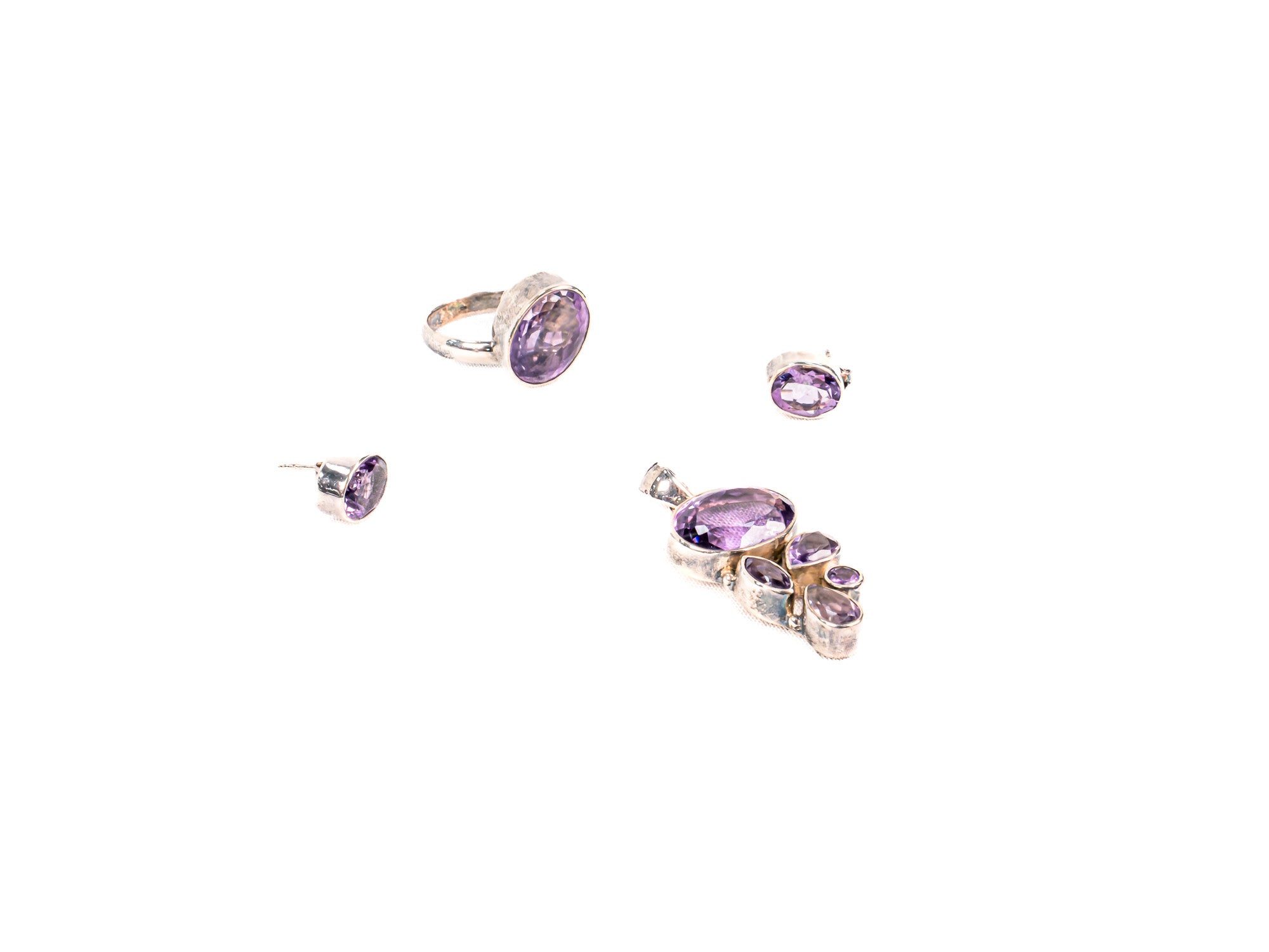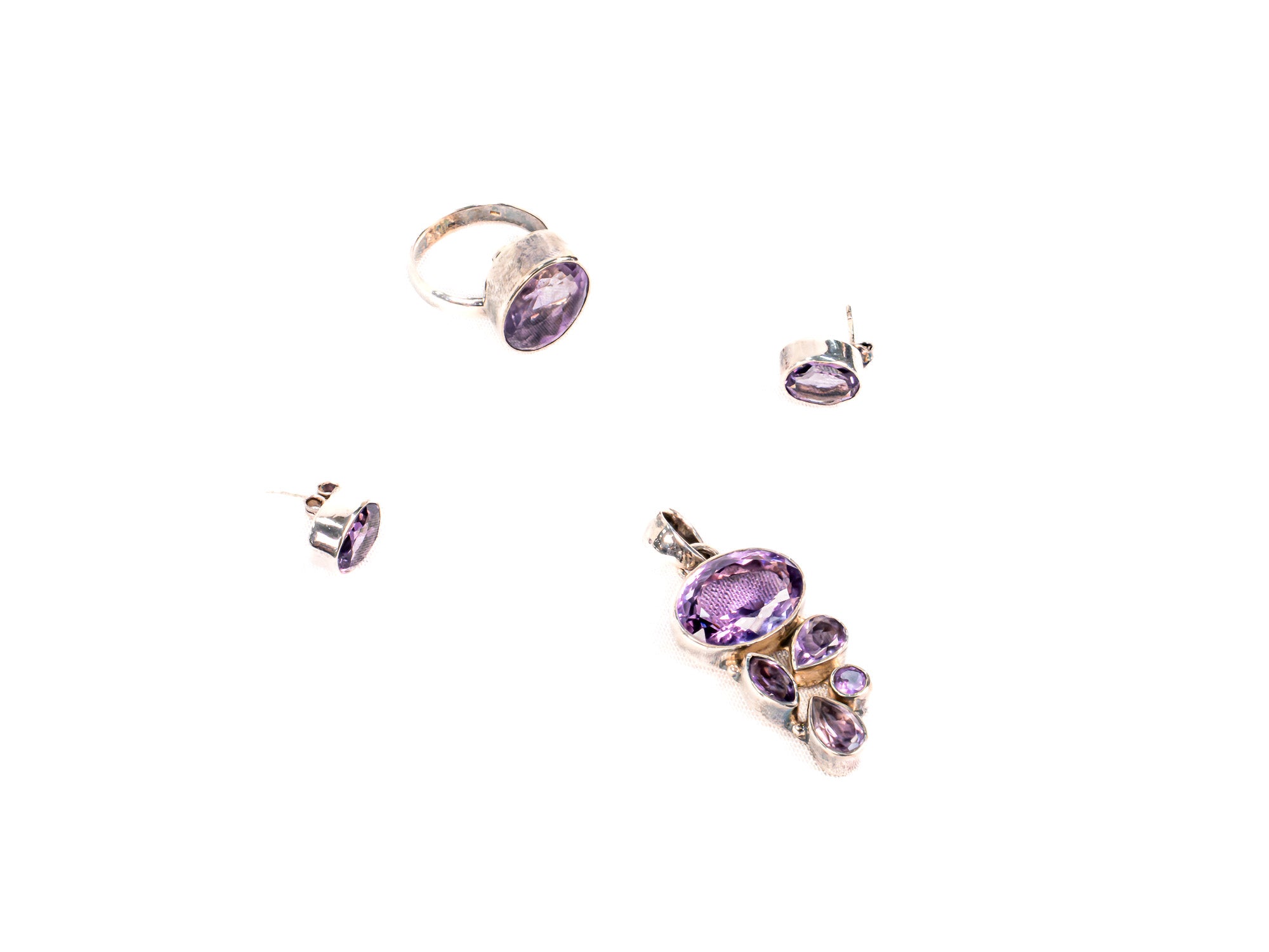 Descopera Set Bijuterii din Argint 925 - Cercei, Inel, Pandantiv, un set de bijuterii din Argint 925 compus din cercei, inel, pandantiv, decorat cu Ametist, in nuante Violet, perfect pentru a adauga eleganta oricarei tinute.