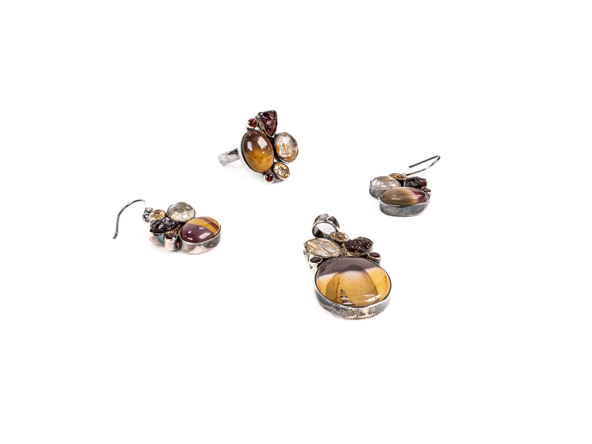Descopera Set Bijuterii din Argint 925 - Cercei, Inel, Pandantiv, un set de bijuterii din Argint 925 compus din cercei, inel, pandantiv, decorat cu Mookaite, Citrin, in nuante Maro, perfect pentru a adauga eleganta oricarei tinute.