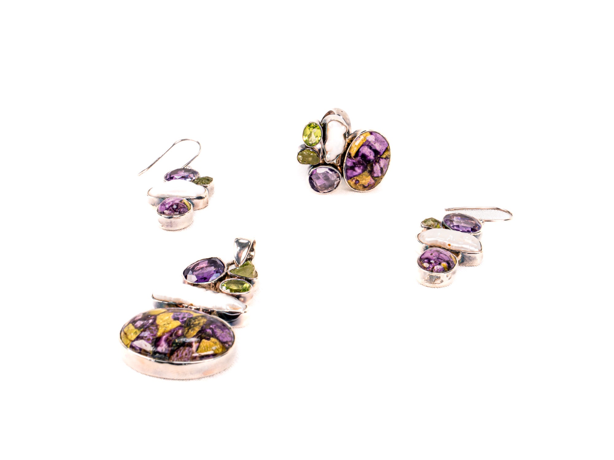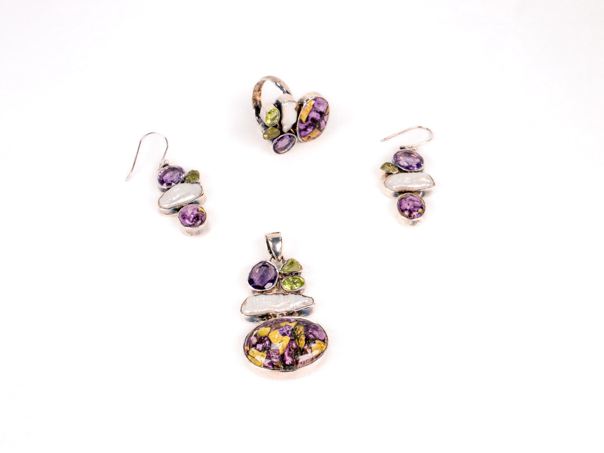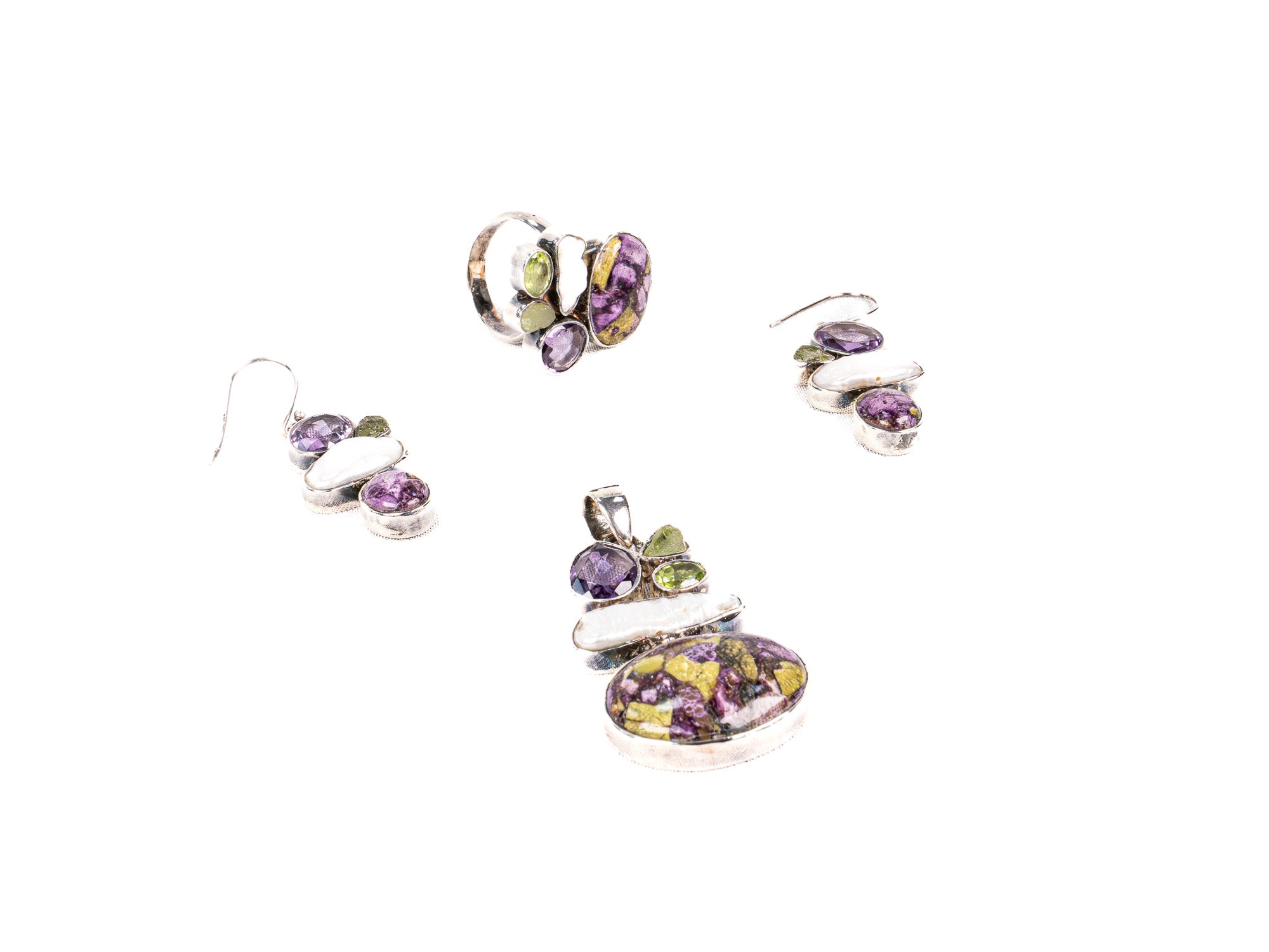 Descopera Set Bijuterii din Argint 925 - Cercei, Inel, Pandantiv, un set de bijuterii din Argint 925 compus din cercei, inel, pandantiv, decorat cu Peridot, Ametist, Turcoaz Mov, in nuante Verde ,Alb, perfect pentru a adauga eleganta oricarei tinute.
