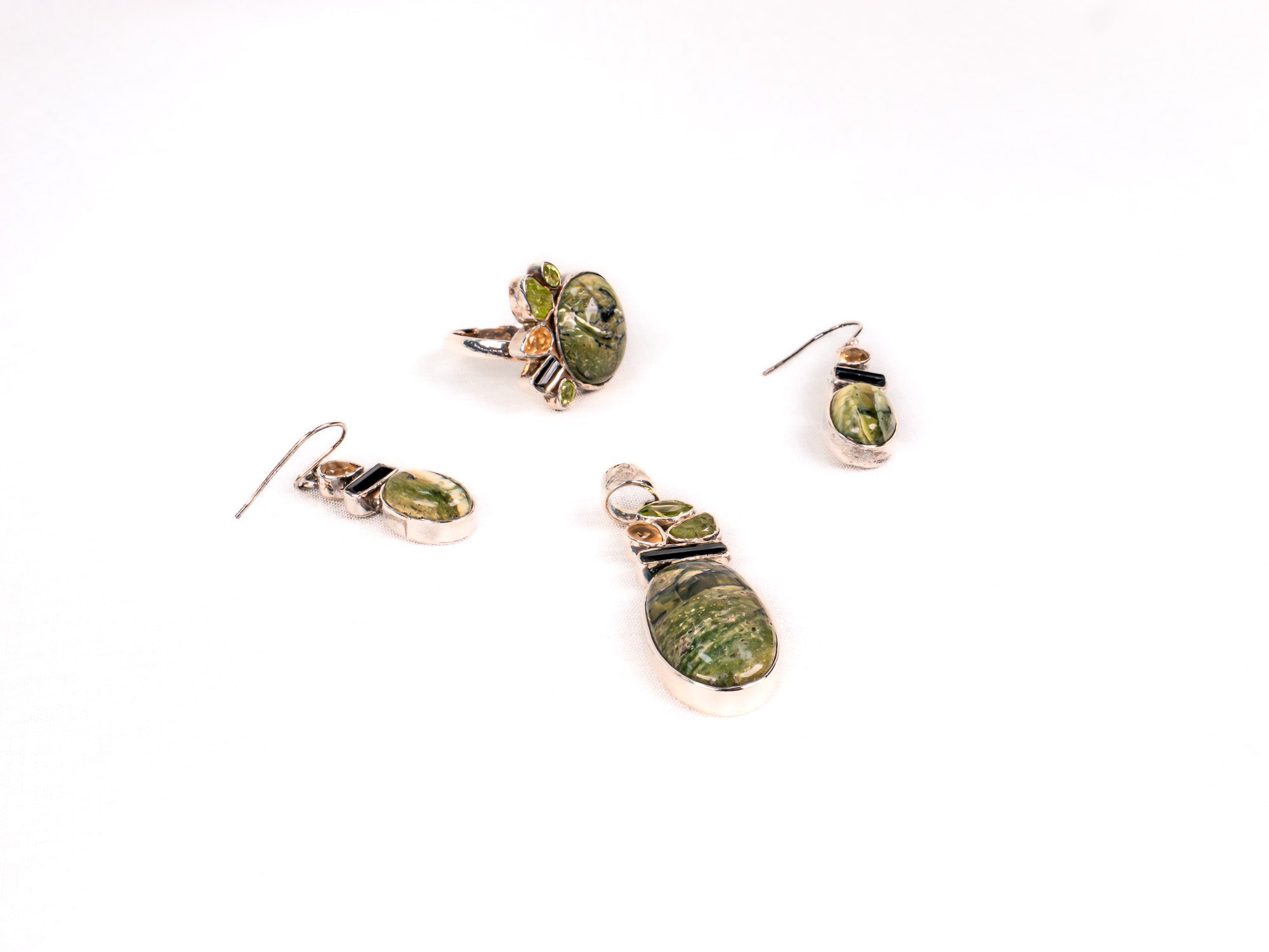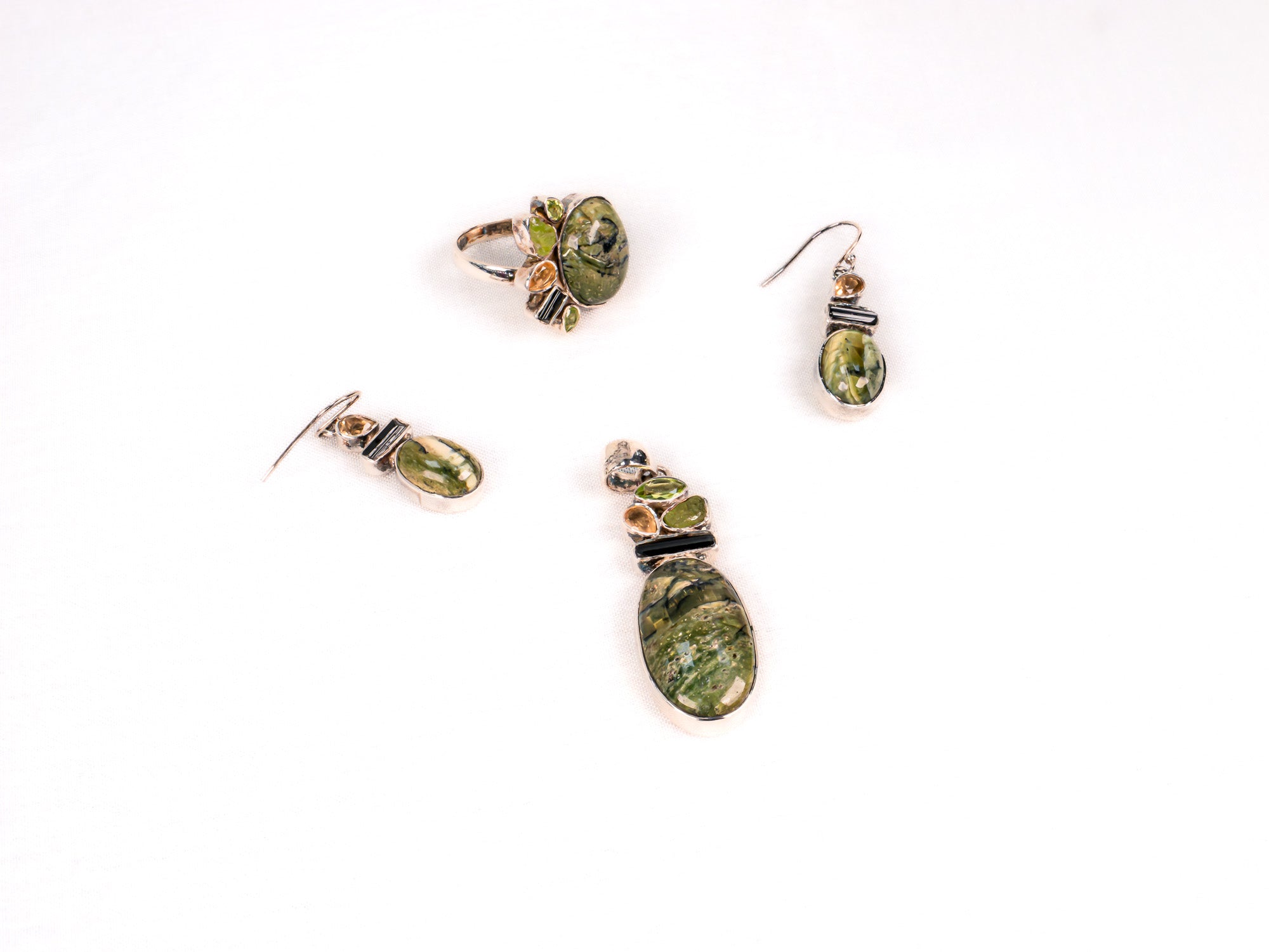 Descopera Set Bijuterii din Argint 925 - Cercei, Inel, Pandantiv, un set de bijuterii din Argint 925 compus din cercei, inel, pandantiv, decorat cu Peridot, Cabochon, Citrin, in nuante Negru, Auriu, perfect pentru a adauga eleganta oricarei tinute.