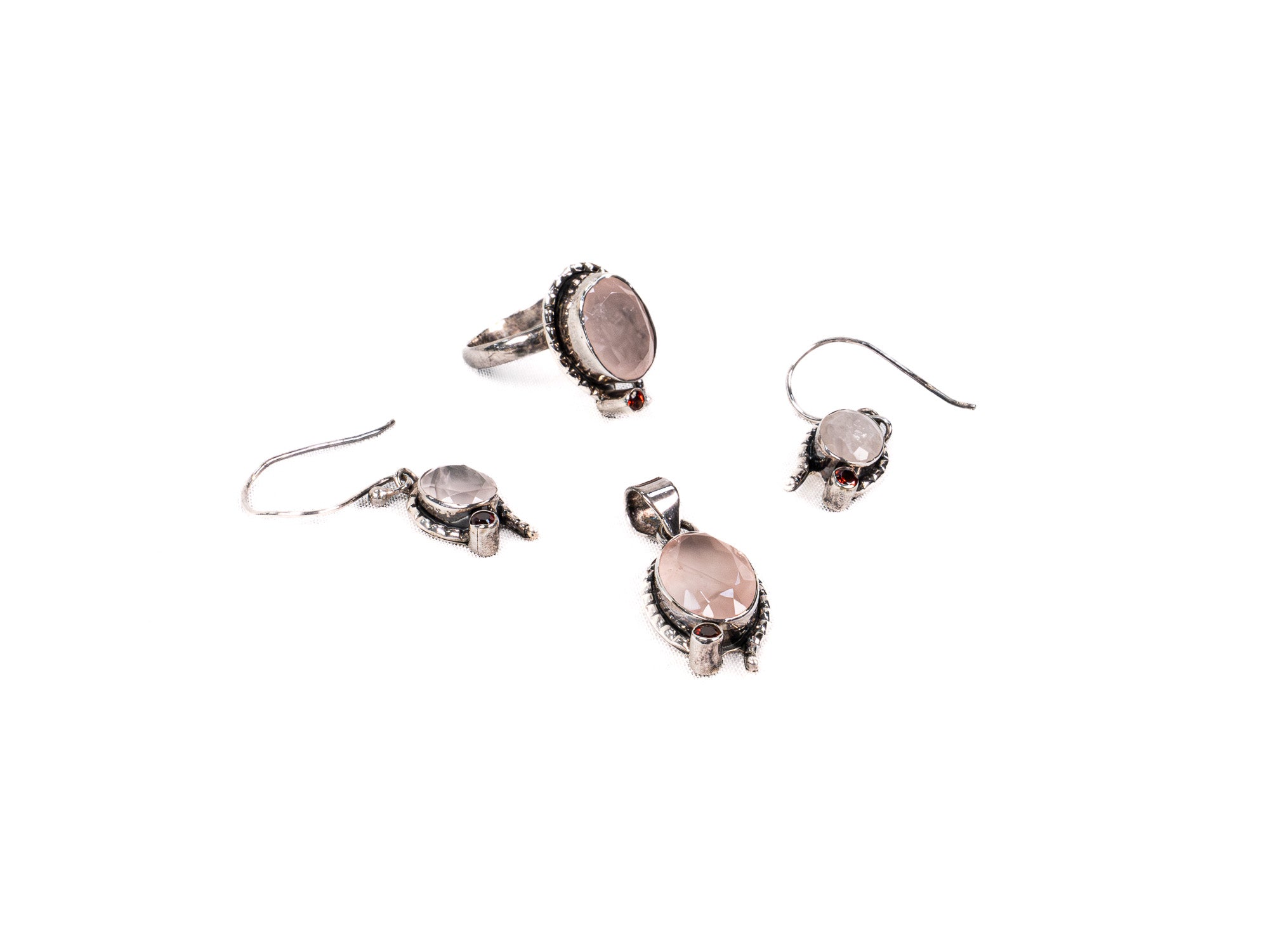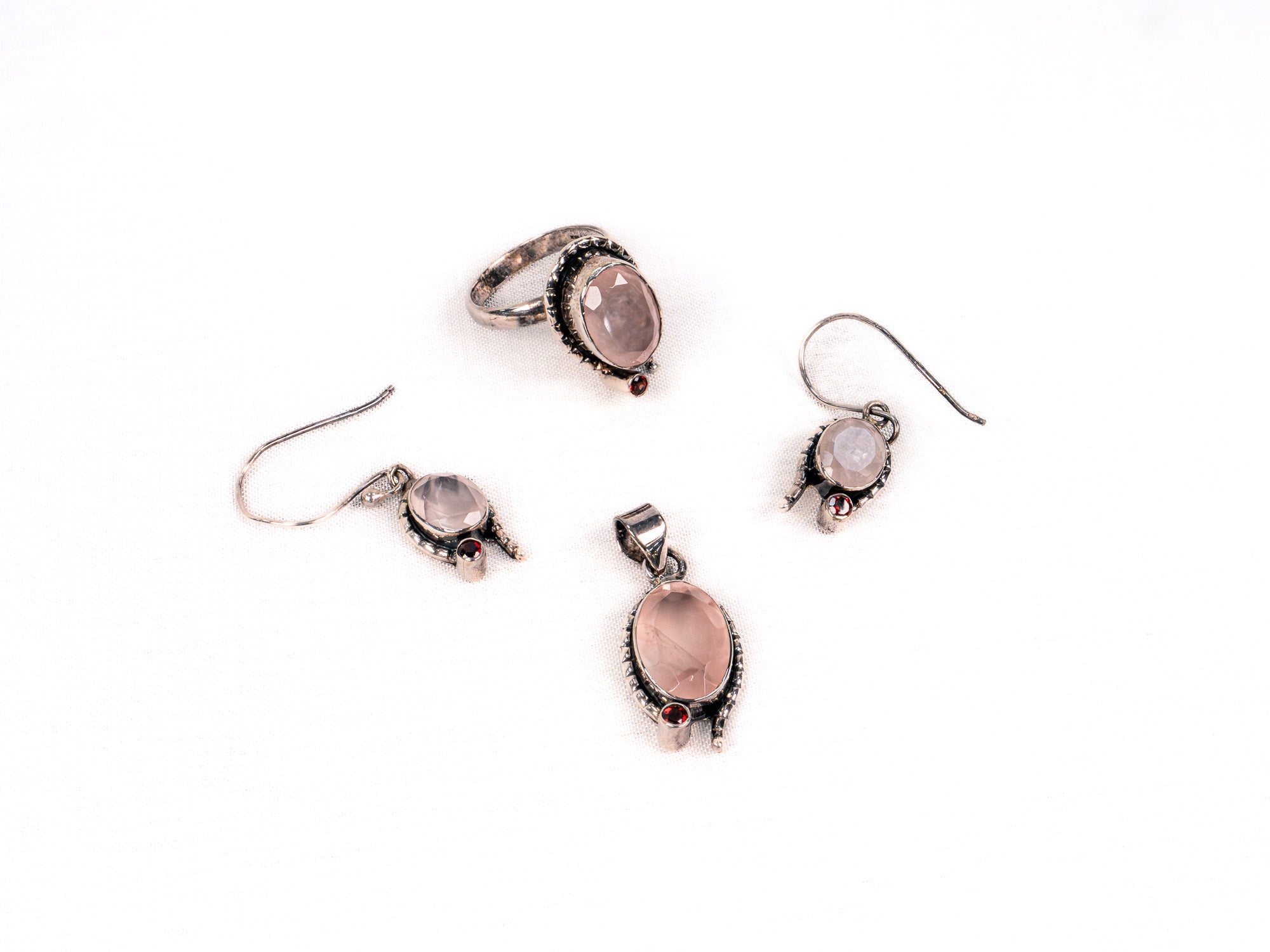 Descopera Set Bijuterii din Argint 925 - Cercei, Inel, Pandantiv, un set de bijuterii din Argint 925 compus din cercei, inel, pandantiv, decorat cu Quartz Roz, Rubin, in nuante Rosu, perfect pentru a adauga eleganta oricarei tinute.