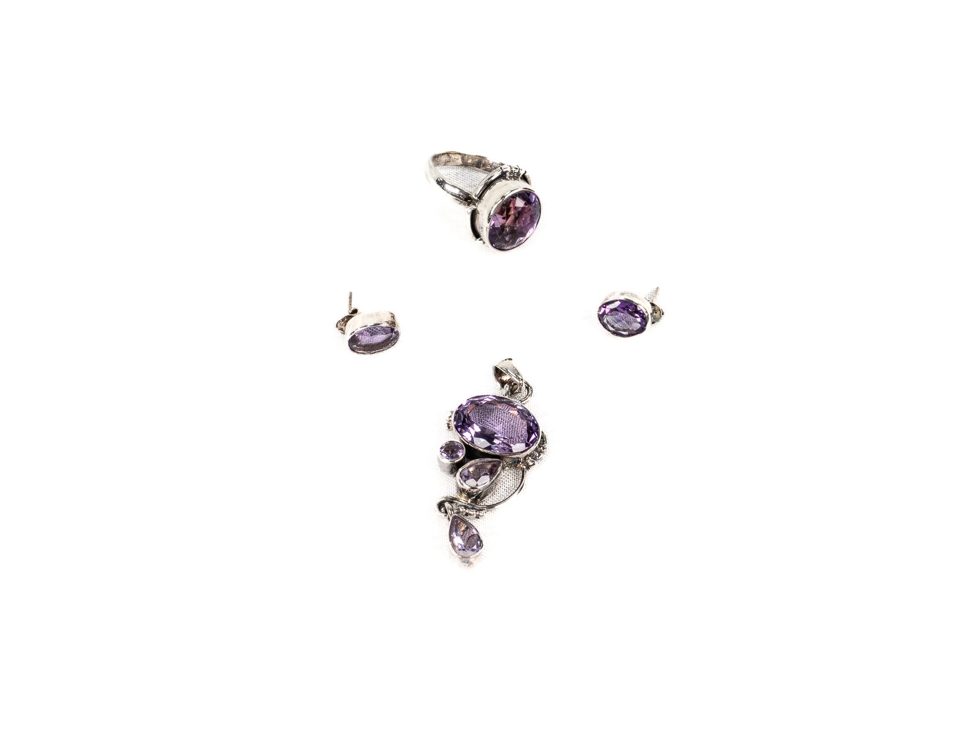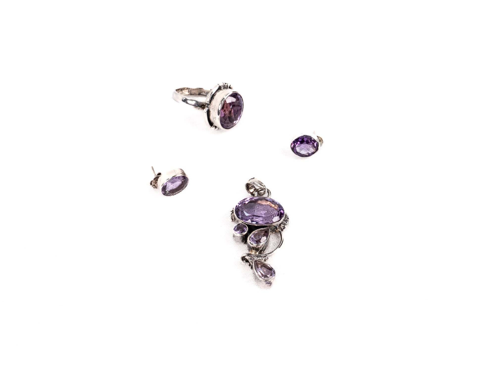 Descopera Set Bijuterii din Argint 925 - Cercei, Pandantiv, Inel, un set de bijuterii din Argint 925 compus din cercei, pandantiv, inel, decorat cu Ametist, in nuante Violet, perfect pentru a adauga eleganta oricarei tinute.